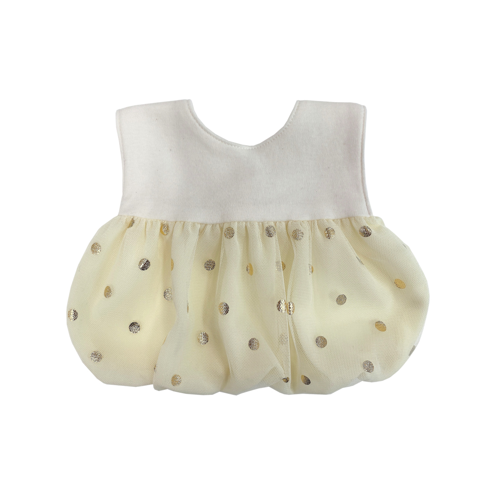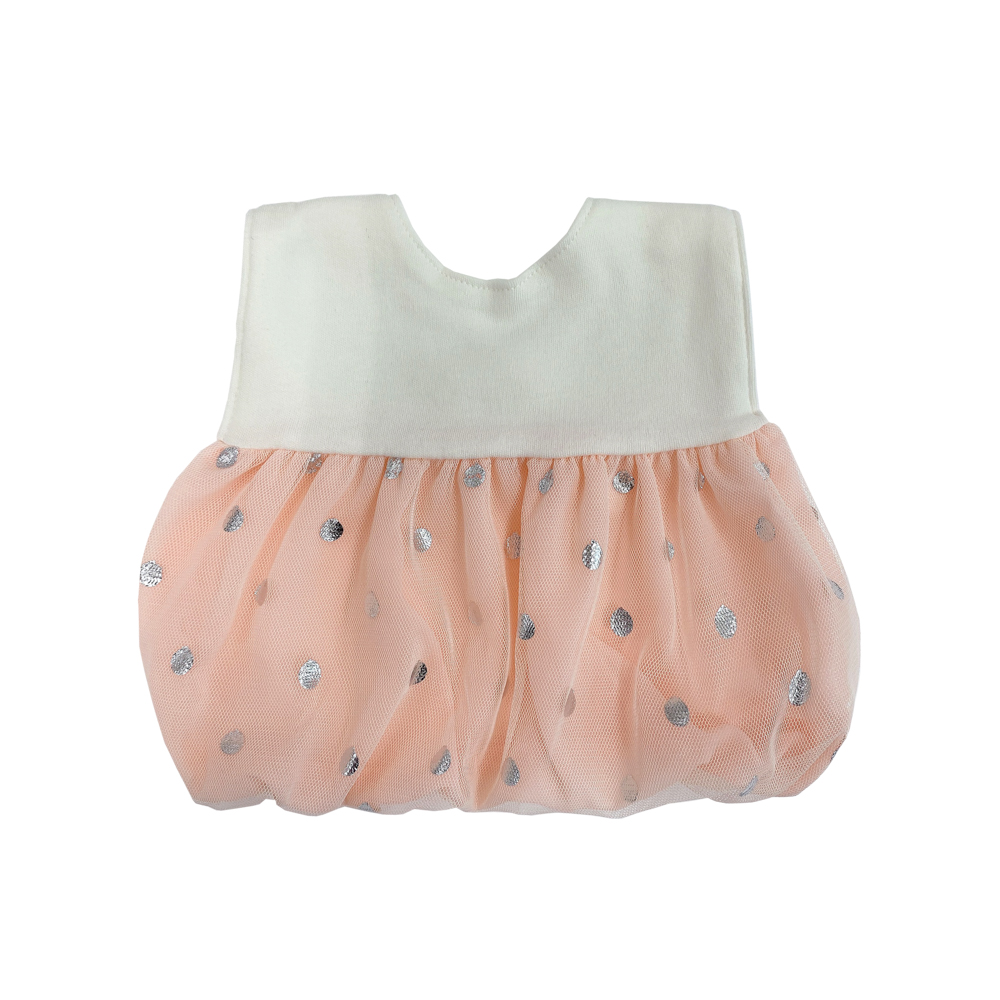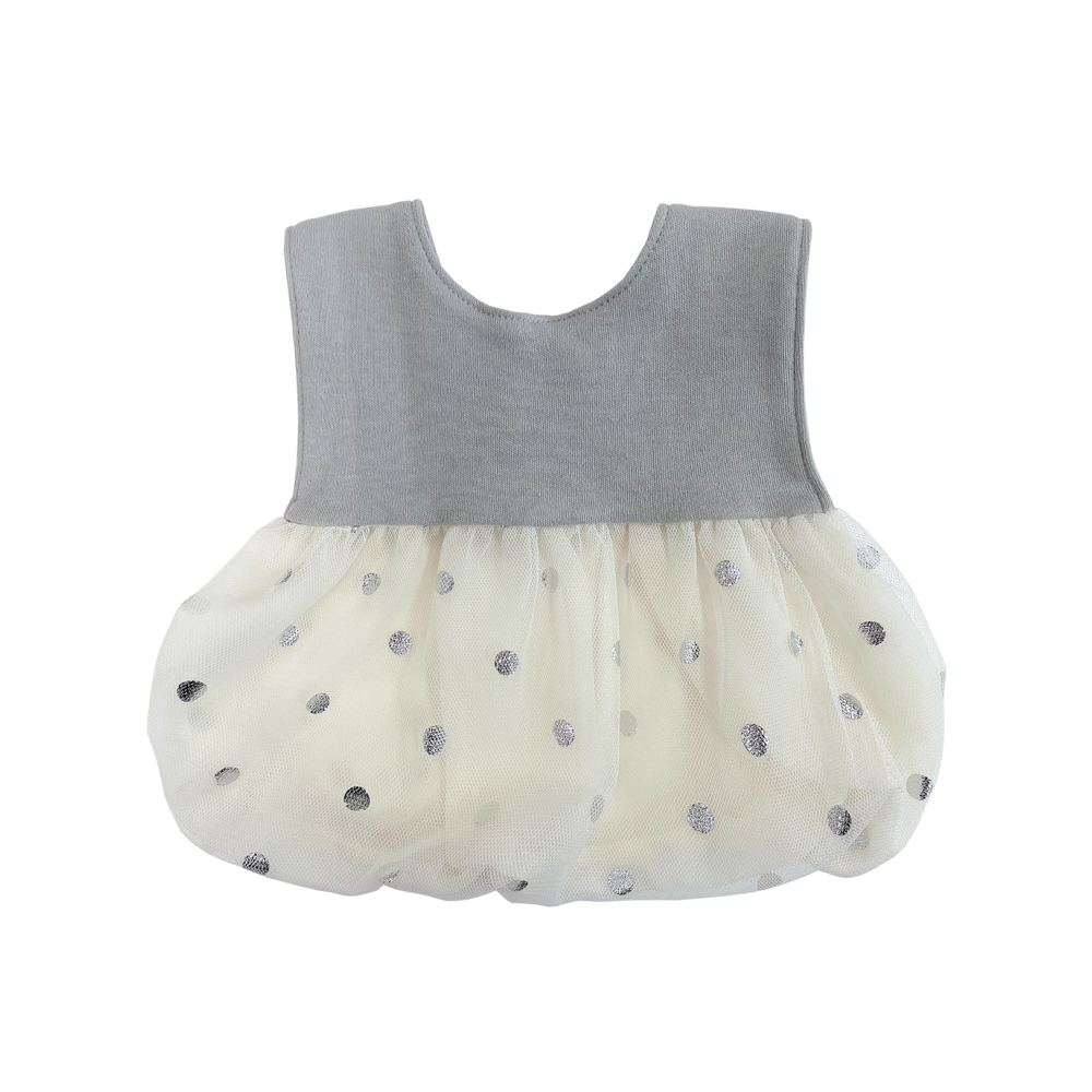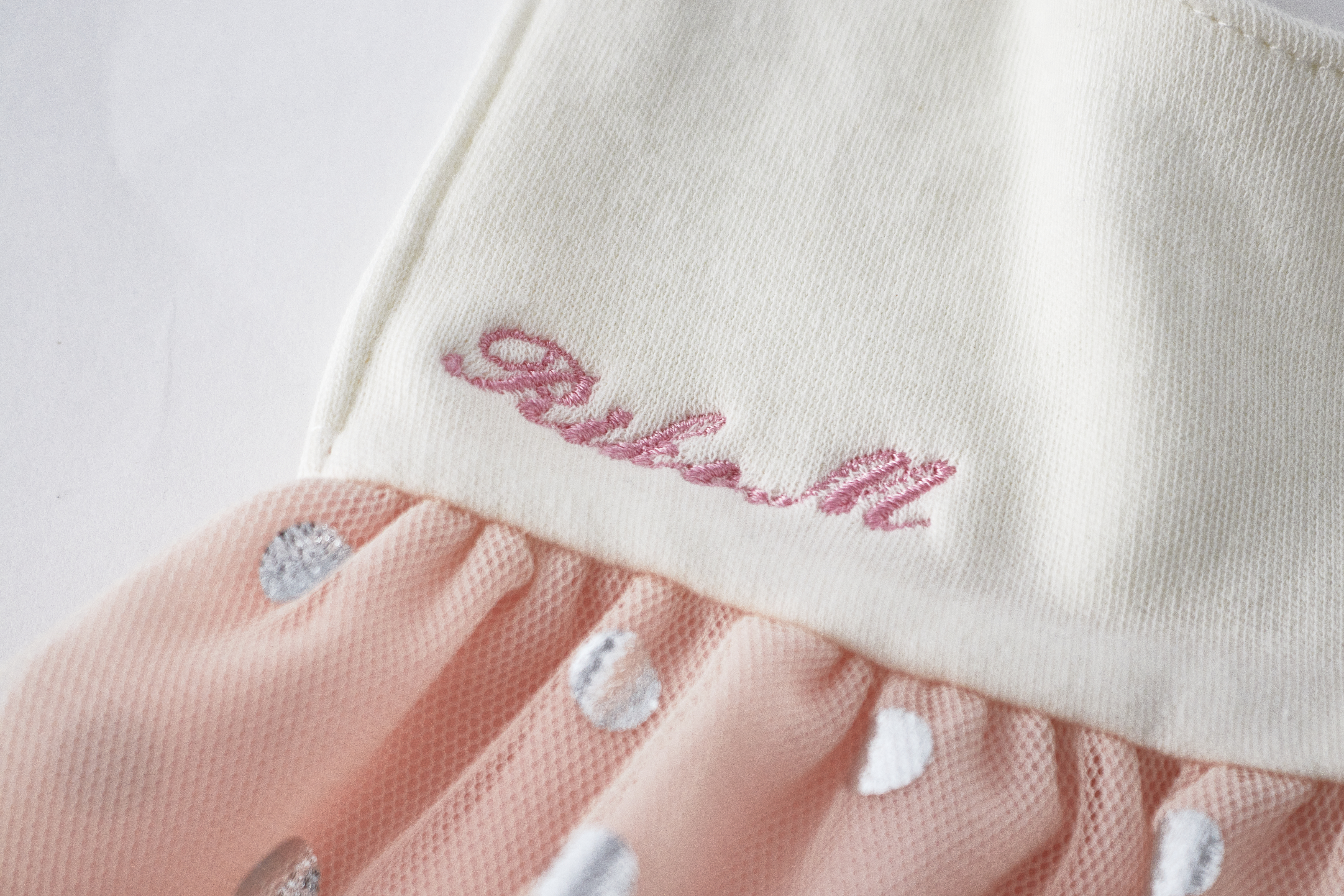 赤ちゃんの肌にあたる部分は柔らかく伸びの良い綿100%の生地を使用し、チュールのラメのドット柄が可愛いらしさを際立てます。