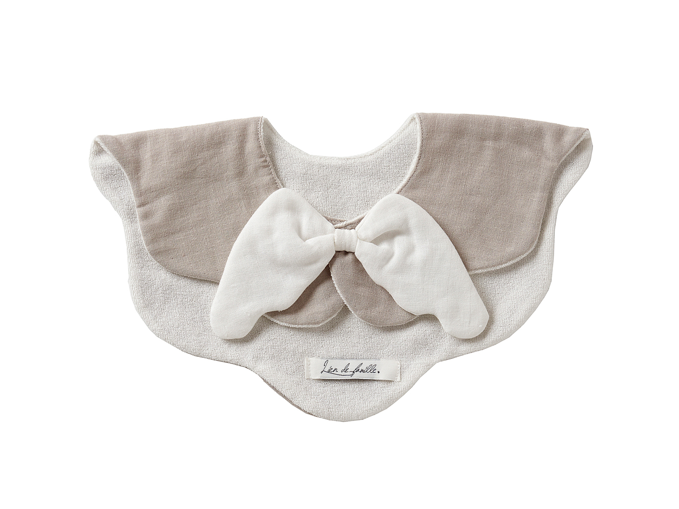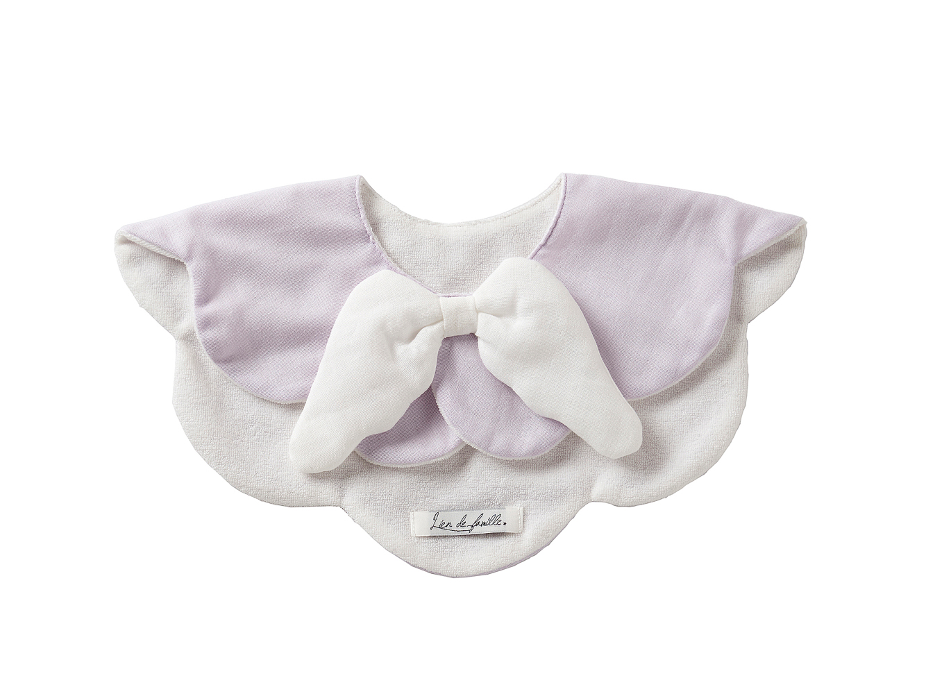 バックスタイルのスナップ部分に大きな天使の羽が可愛さ抜群の「もこもこ天使スタイ」です。