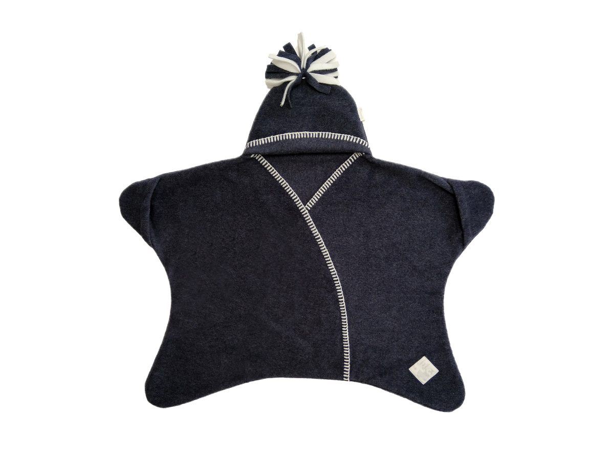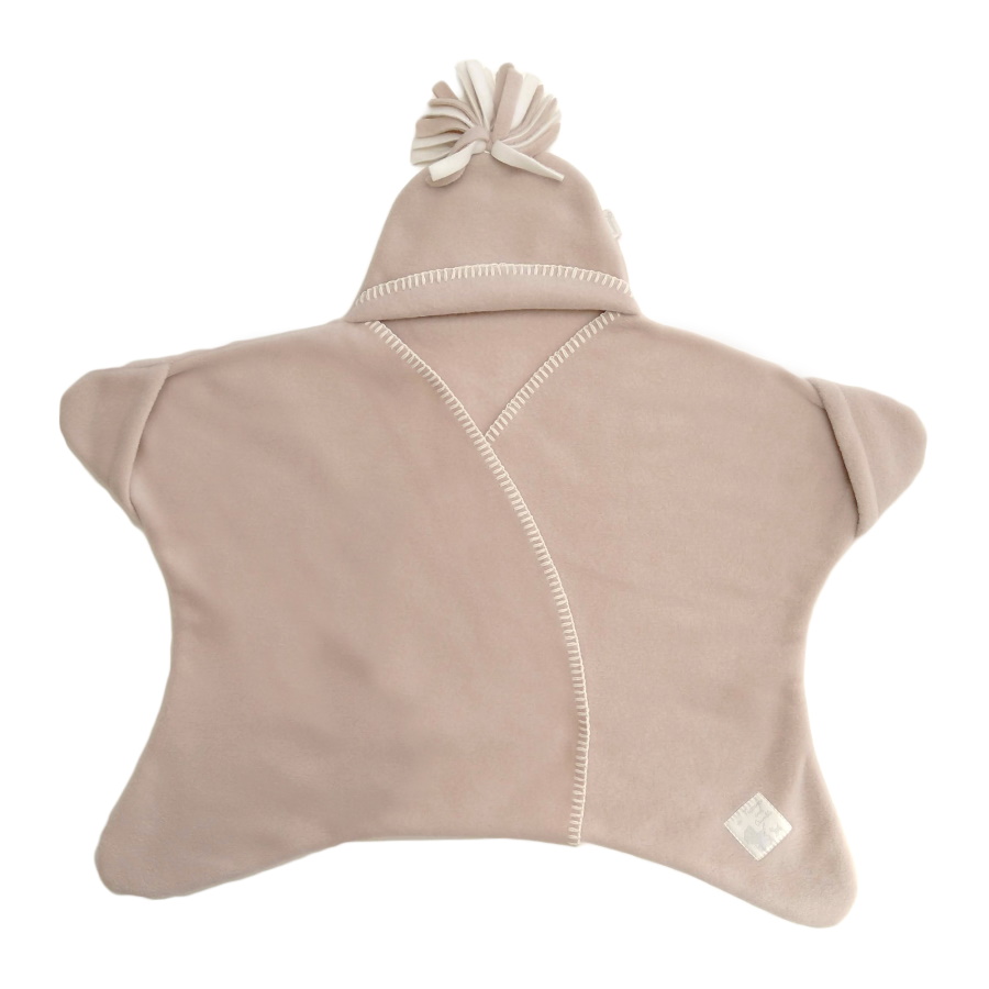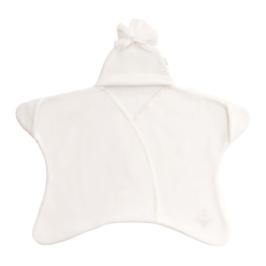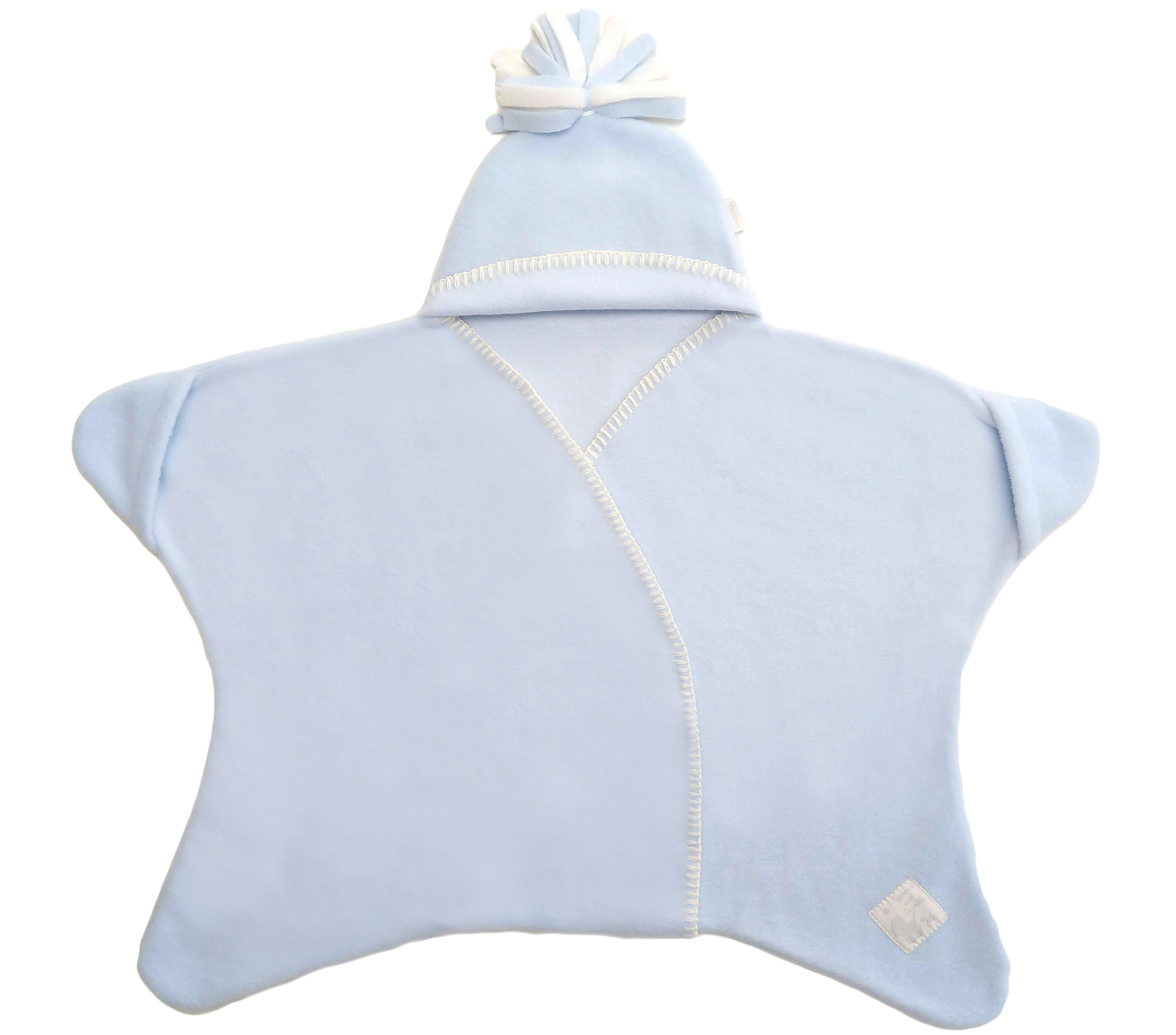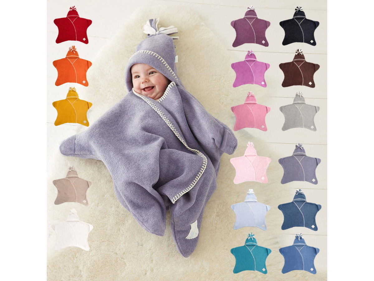 大口注文・法人のお問い合わせはこちら両手を広げると星になった様な赤ちゃんの姿がとっても可愛らしいおくるみです。ファスナーやボタンが無いので着脱が簡単です。新生児~生後4ヶ月頃の赤ちゃんのおくるみや防寒アイテムとして活躍します。