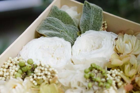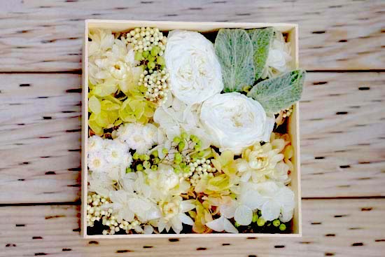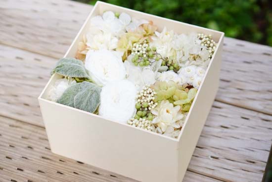 大口注文・法人のお問い合わせはこちら優しい印象のグリーンと一緒に、清楚で繊細なホワイトカラーの花々をボックスいっぱいに敷き詰められています。見る度に心安らぐ色合いです。グリーンとホワイトをベースとしたシンプルな仕上がりのため、女性はもちろん男性へのプレゼントにもおすすめです。