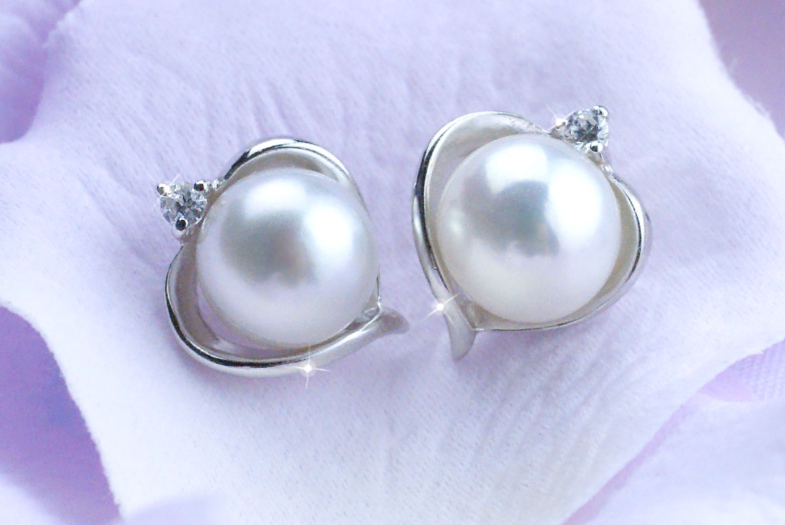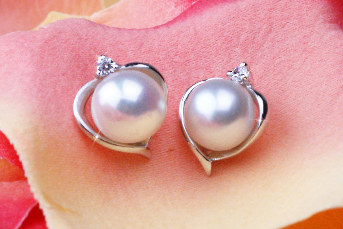 大口注文・法人のお問い合わせはこちら美しく輝く淡水真珠をハート形で包み込み、ダイヤの冠を載せたような、 何とも可愛らしいデザインのハートピアス。パールの直径は約8mm。 品格漂う清楚な美しさで、身に着ける人の印象を、柔らかく、フェミニンに仕上げます。