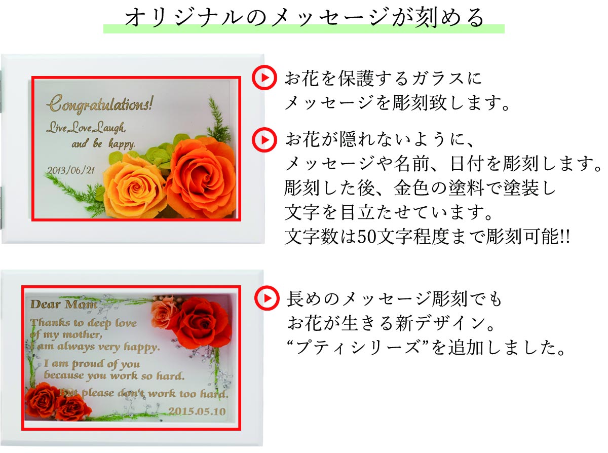 お客様の思いのまま、オリジナルメッセージをお送りください。 彫刻可能な文字数は50文字程度まで。プティシリーズは最大100文字程度彫刻できます。 彫刻したいメッセージは、自由記入欄にて記入ください。 フォントはページ下部にある"メッセージ彫刻フォントサンプル"をご参照ください。 なお、メッセージのニュアンス等が変わってしまう恐れがありますので、日本語から英語への翻訳は承りかねます。 【ご注意事項】 文字数が多くなりますと、お花とメッセージが大きく重なるようになります。 デザイン性を高めるには文字数少なめがオススメです。 ご希望でしたらメールで彫刻サンプルをお送りいたしますので、ご確認・ご変更も可能です!