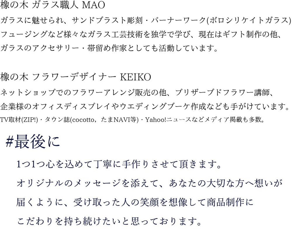 "橡の木"では自社工房で企画・制作・仕上げを行います。 ガラス作家とフラワーデザイナーの連携によりきめ細やかなデザインを実現しています。