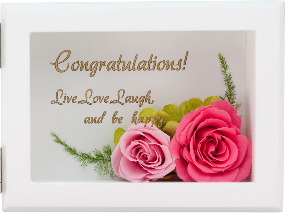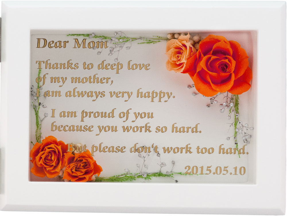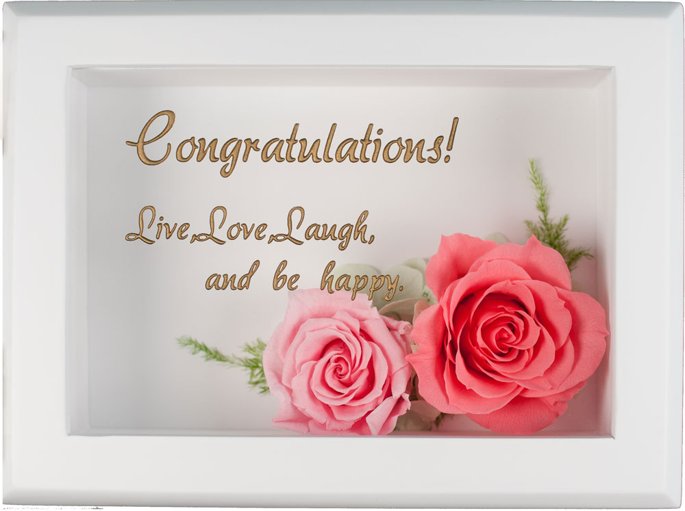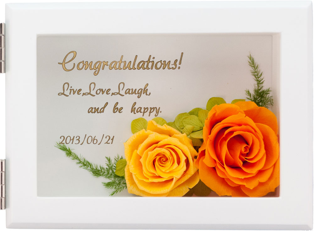 フォトフレームに、プリザーブドフラワーアレンジメントを添え、保護ガラスにメッセージを彫刻した「L版プリザーブドフラワーフォトフレーム」です。名入れ、メッセージ彫刻がギフトのオリジナリティーを更に高めます。思い出に残る贈り物になります。
