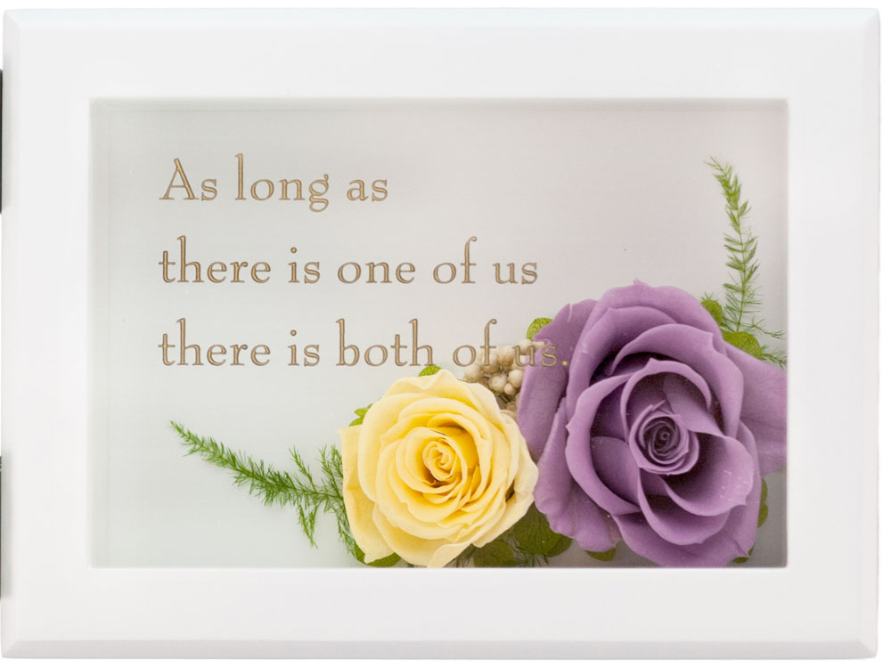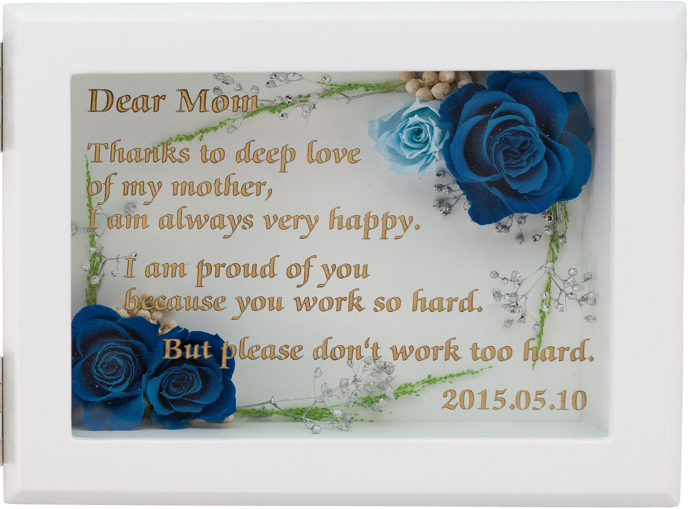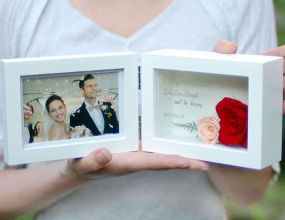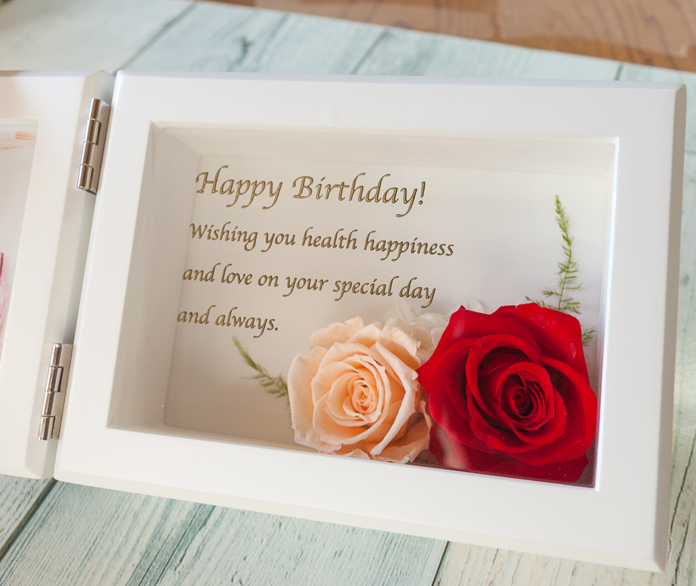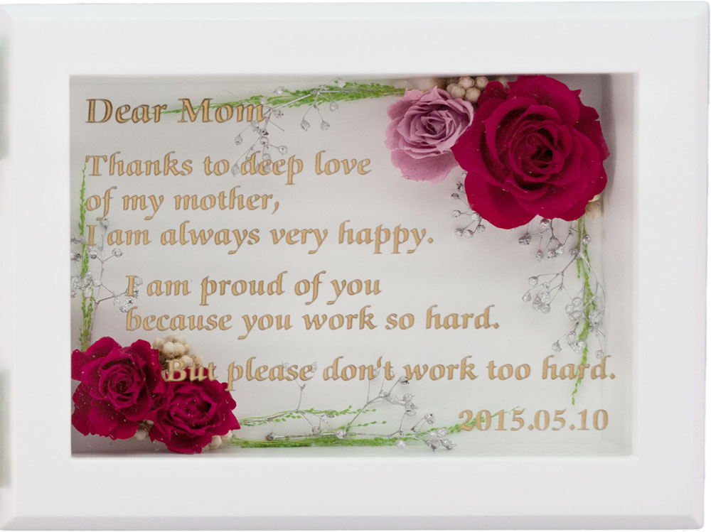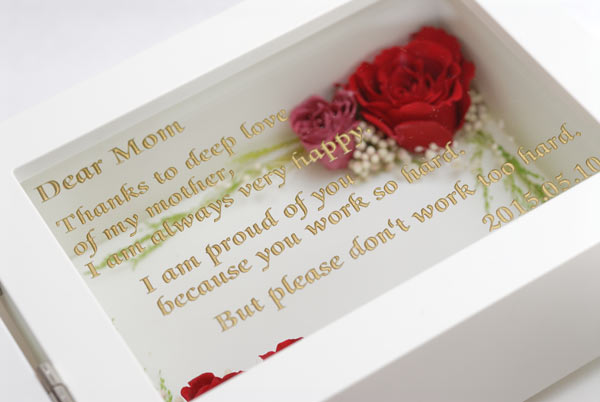 フォトフレームに、プリザーブドフラワーアレンジメントを添え、保護ガラスにメッセージを彫刻した「L版プリザーブドフラワーフォトフレーム」。思い出に残る贈り物になります。大切な方への贈り物としていかがですか?