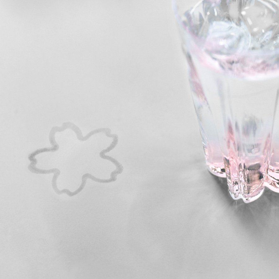 外気と内部の温度差によってできる結露の現象を生かし、テーブルの上に桜の花が咲く特別なグラスです。 形や機能にこだわることはもちろん、自然現象で生じる結露も美しく見せることで、邪魔に感じていた結露でさえ、普段の生活に楽しみをもたらしてくれる大切な存在になるかもしれません。