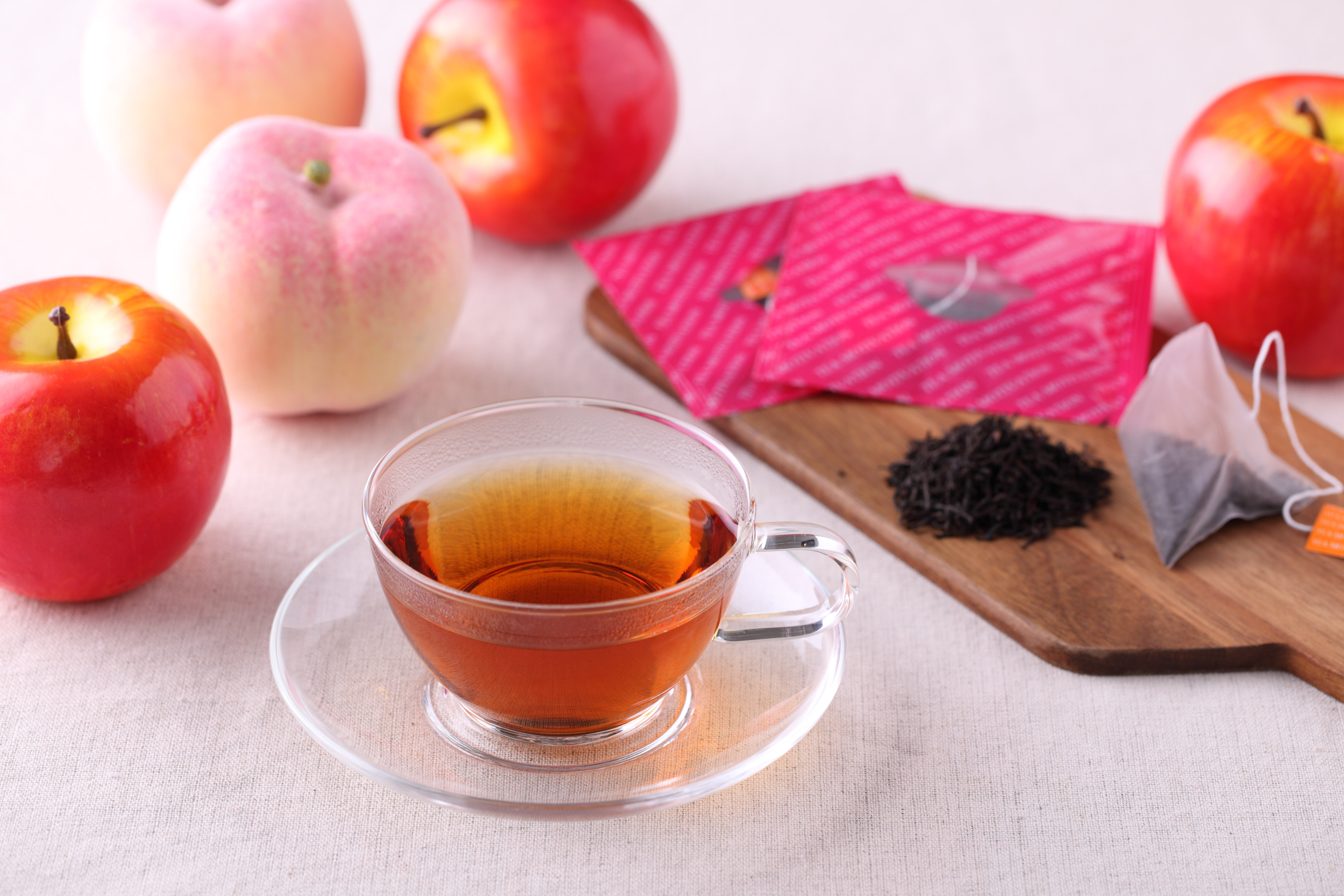 ももとりんごのフレッシュで甘い香りのフレーバーティー。 もぎたてのフルーツを思わせるみずみずしさが詰まっています
