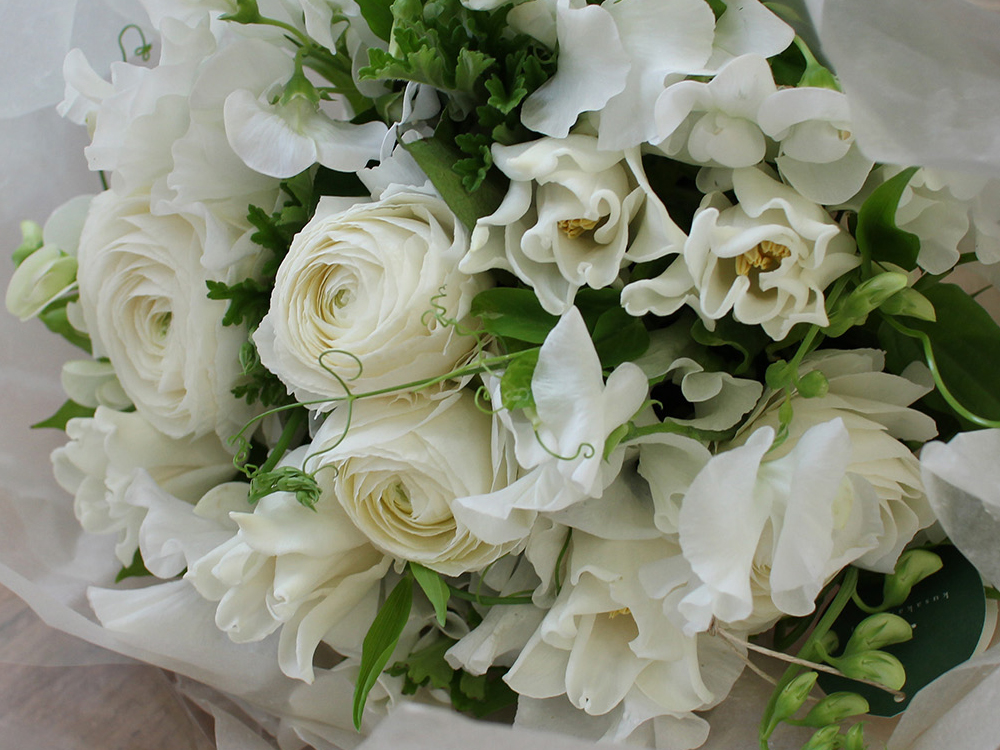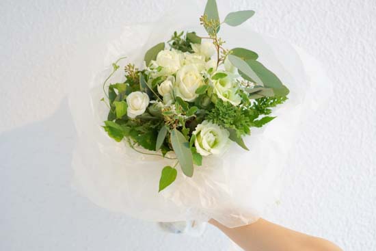 記念日や誕生日、お渡しされる相手のイメージなどを反映したブーケをおつくりいたします。同じものが一つとしてない、オリジナルのブーケです。 ※色味は白×緑のみとなります。 ご希望のイメージがある場合は、注文画面の備考欄にご記入ください。