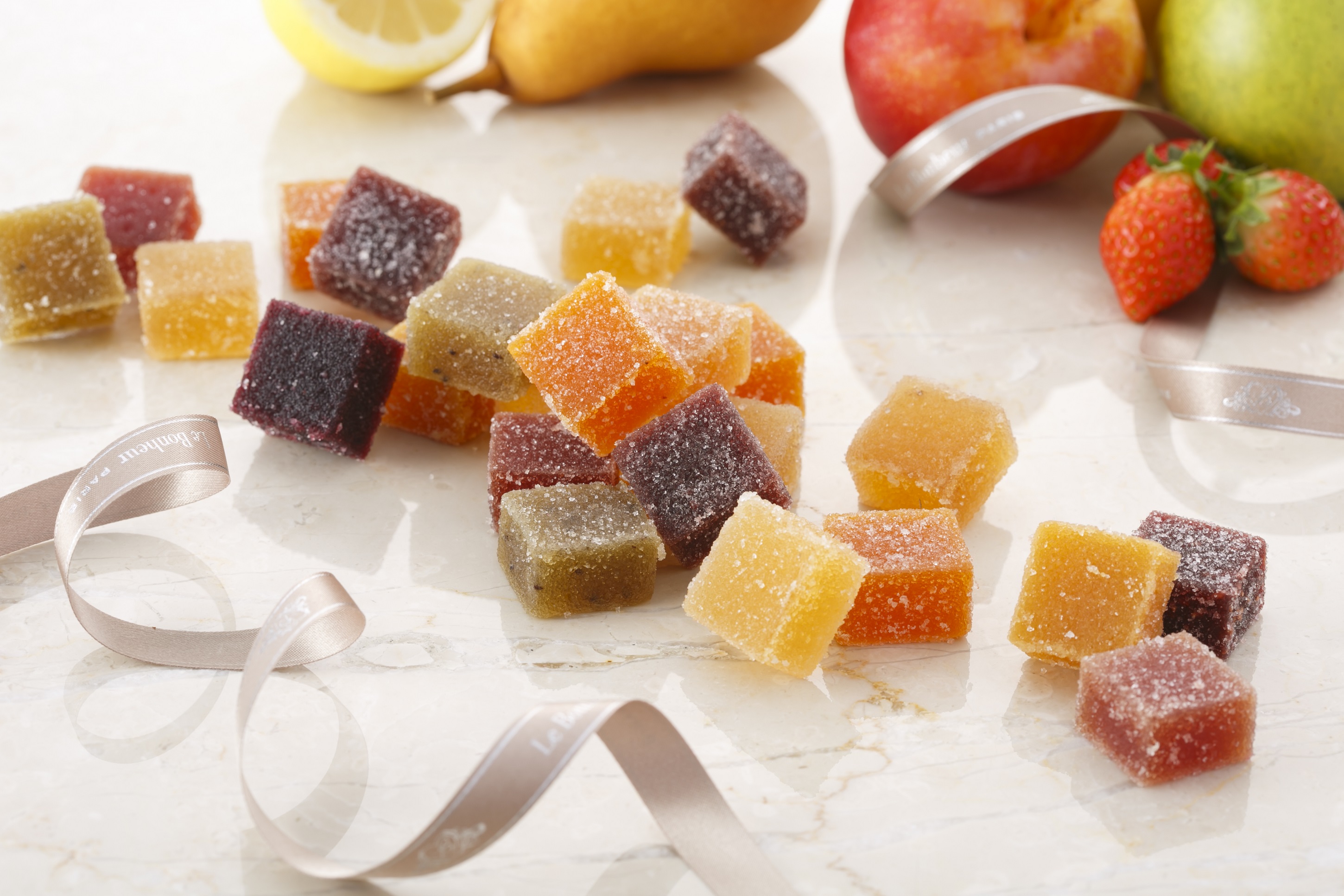 大口注文・法人のお問い合わせはこちらフランス各地で収穫された良質なフルーツを原材料に作られたパート・ドゥ・フリュイ。 パート・ドゥ・フリュイとは、総重量の50%相当をフルーツで占めるジューシーなフルーツゼリーです。仏アカデミー・フランセーゼ パティシエ(ショコラティエ部門)教授長、グザビエ・コンロー氏監修によるこだわりの逸品で、1粒1粒に厳選された果実の旨みが凝縮され、口に入れた瞬間、フルーツの自然な甘さと上品な香りが広がります。