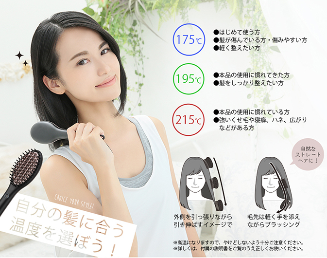 大口注文・法人のお問い合わせはこちらブラシで髪をとかすだけで簡単ナチュラルストレートが実現. 定番のブラシ型のため、どなたでも簡単にお使いいただけます。電源を入れていつもどおりに整えるように髪をブラッシングするだけ!