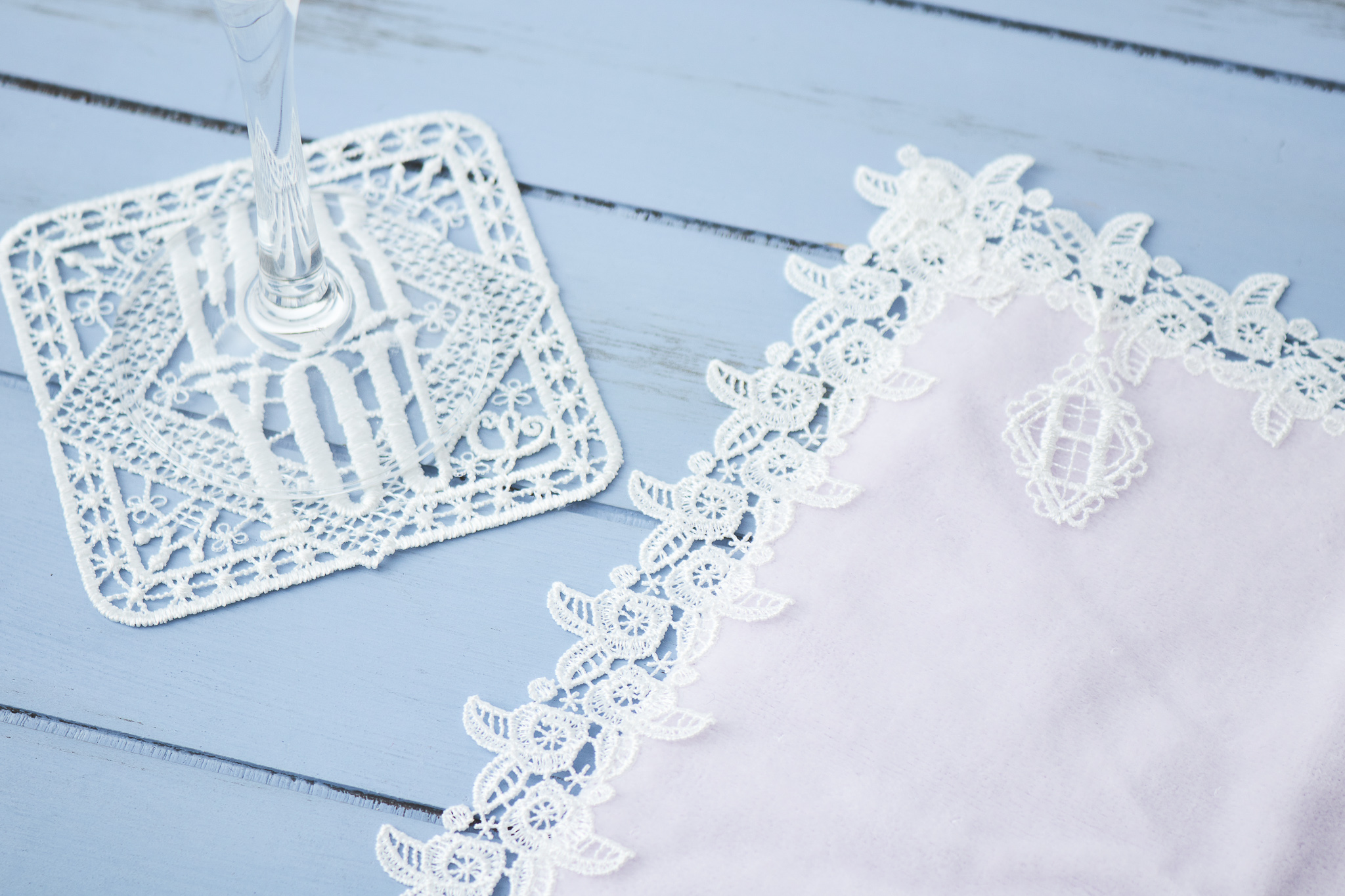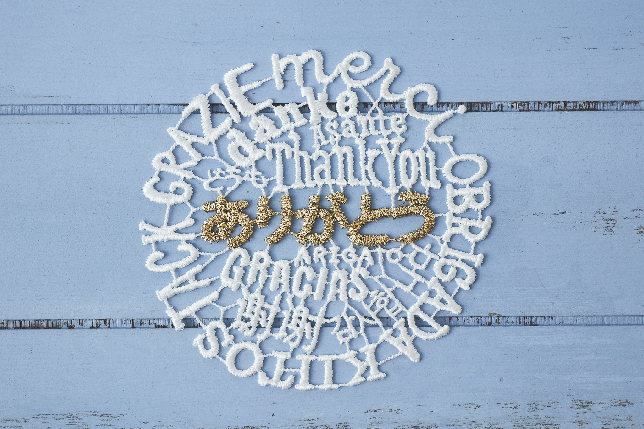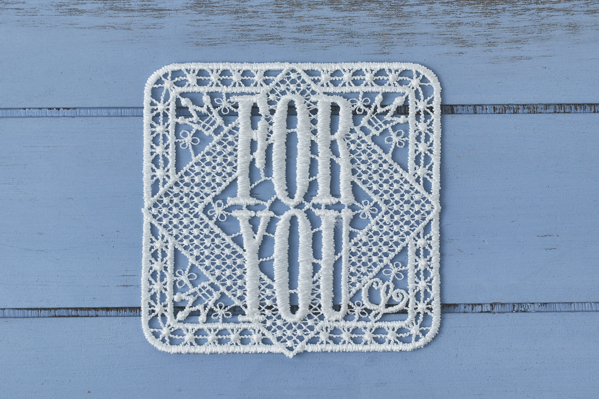 メッセージをレースに込めて織り上げました。近沢レース店ならではのシリーズです。 コースターとしてはもちろん、ルームアクセサリーやメッセージカードとして、また、額に飾ってインテリアにもお使いいただけます。送る人の個性が光るギフトを演出いたします。