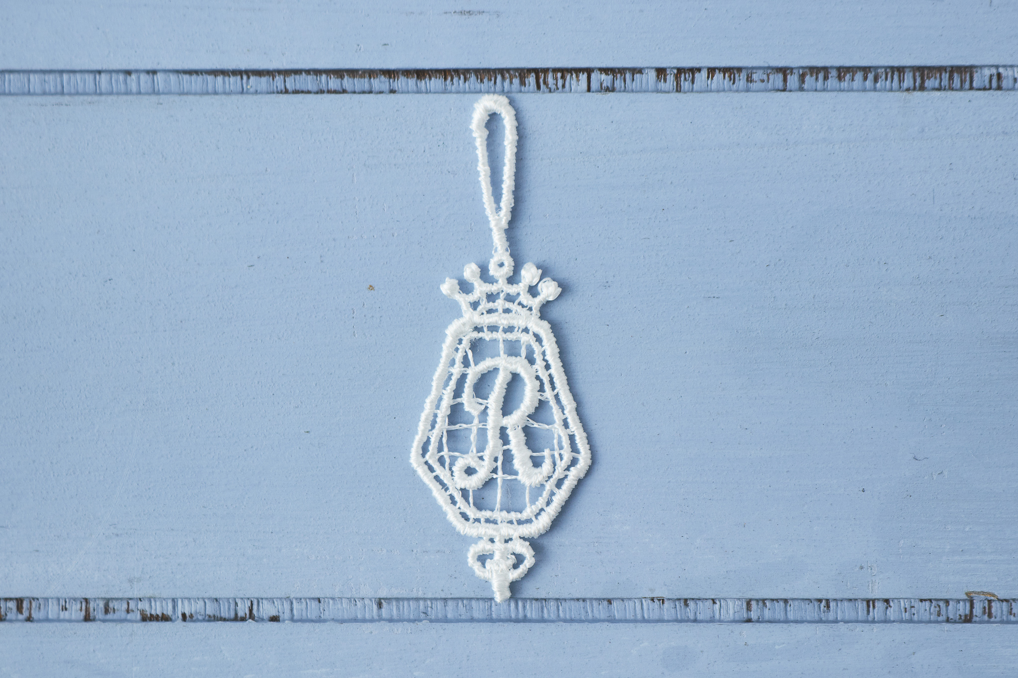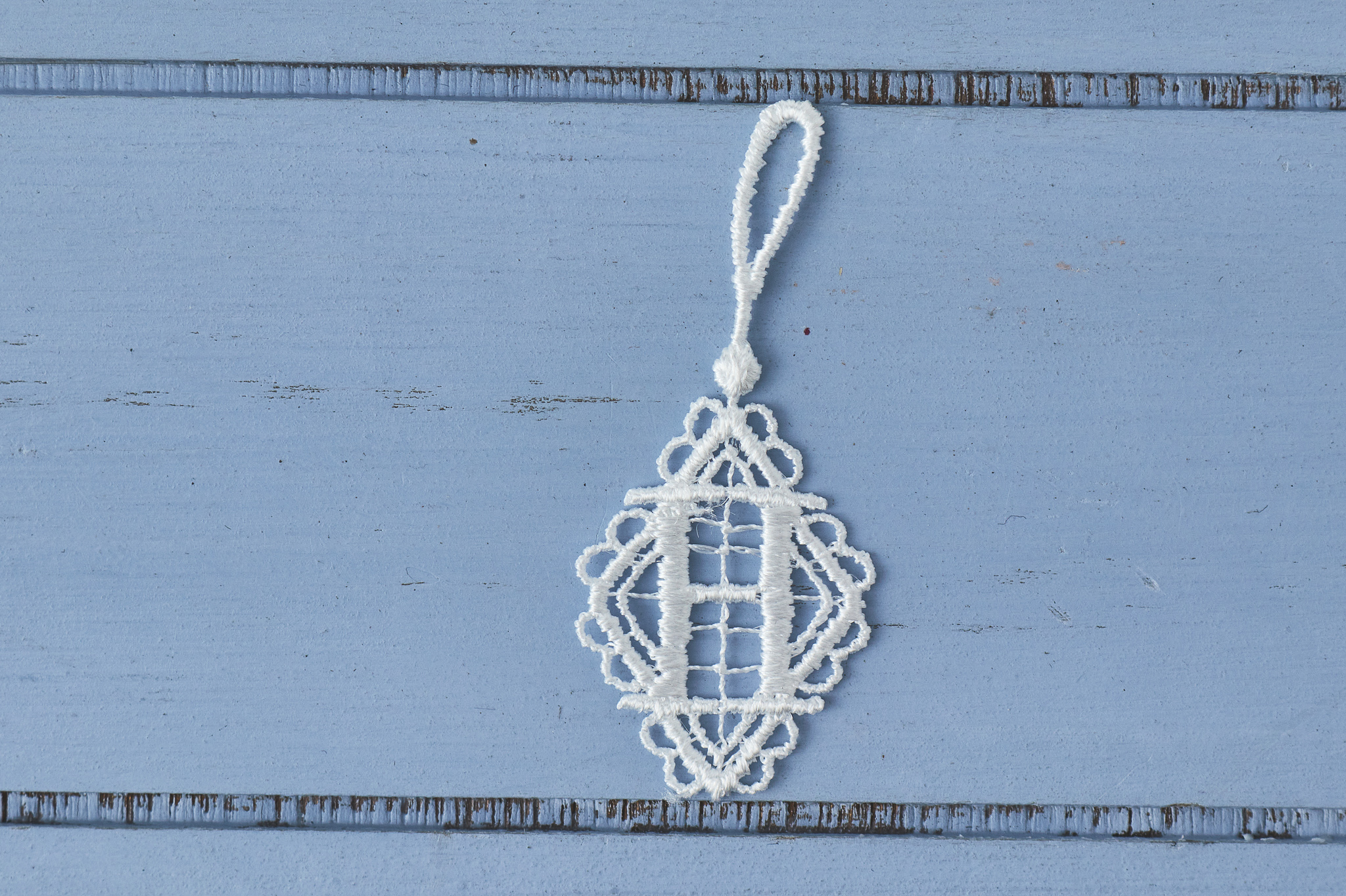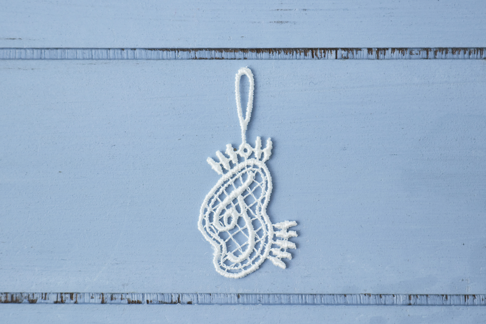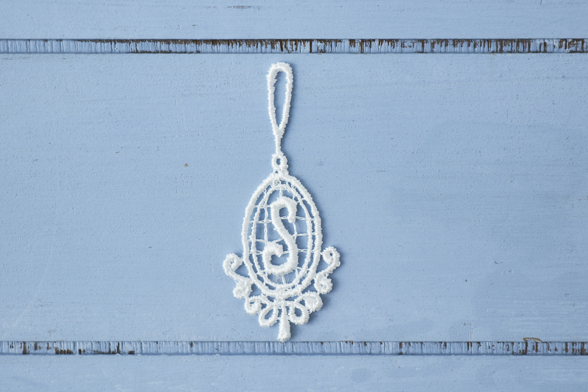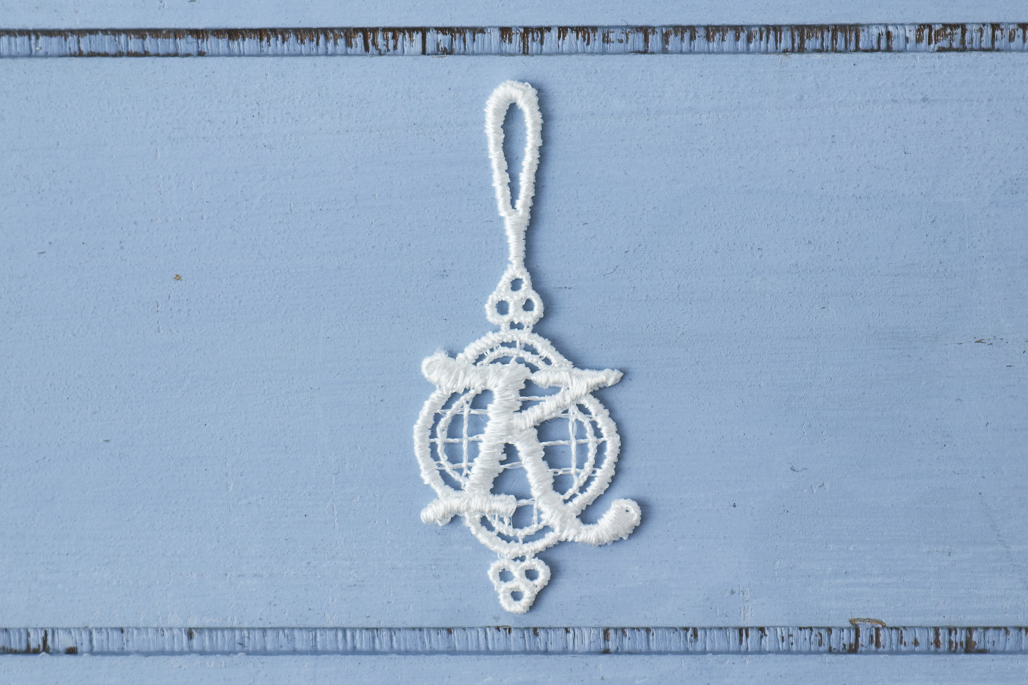 アルファベットを1つ1つデザインを変え、ギュピールレースで仕上げました。 指で簡単に取り付けることができ、楽しいあそび心のあるハンカチが出来上がります。もちろん洗濯機での、お洗濯も可能です。