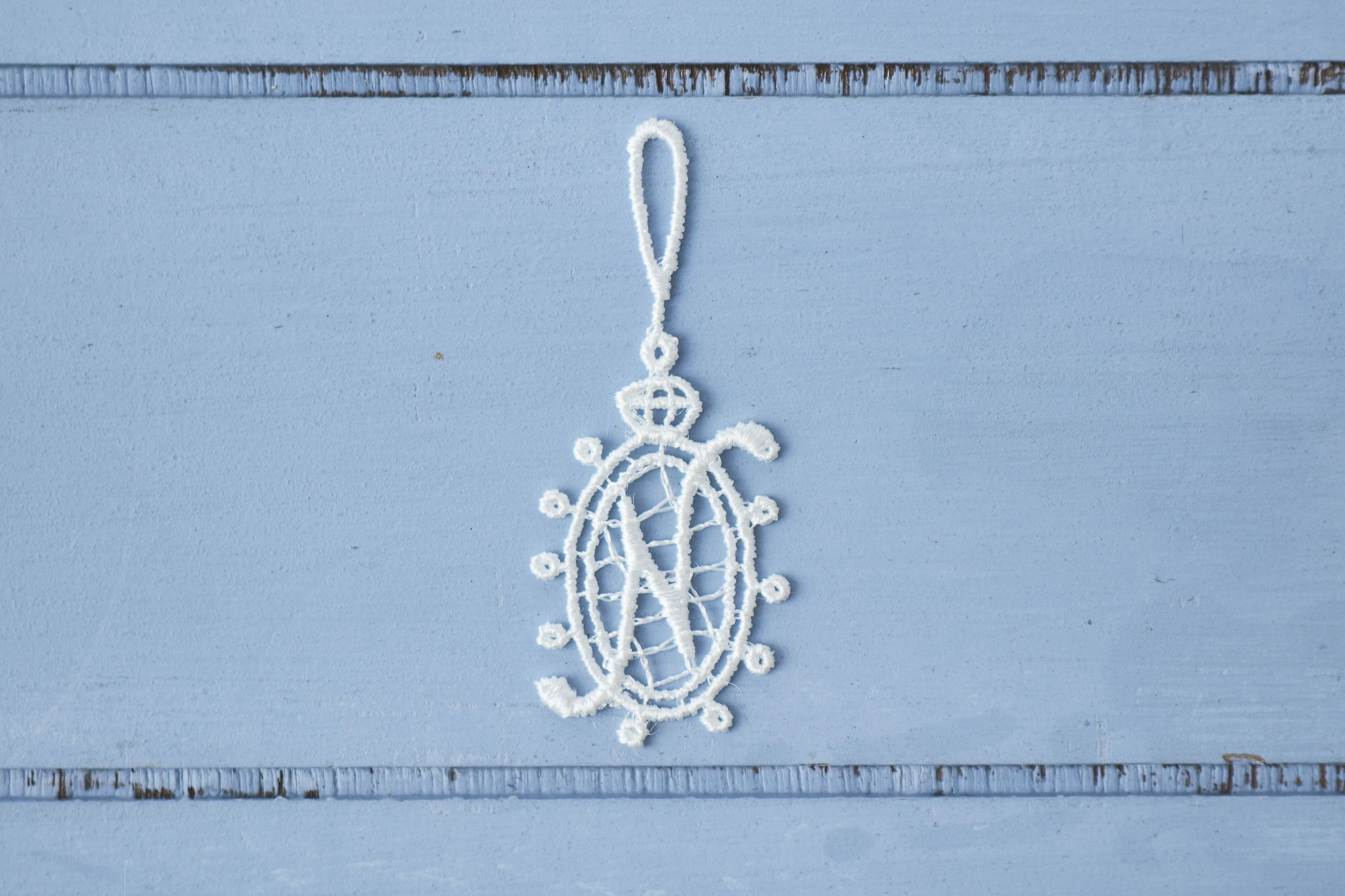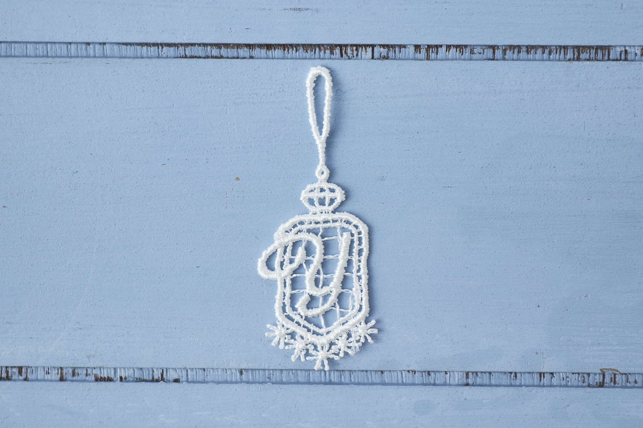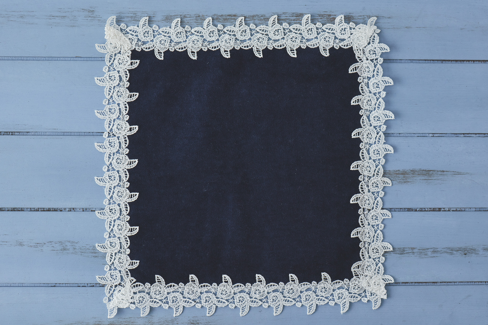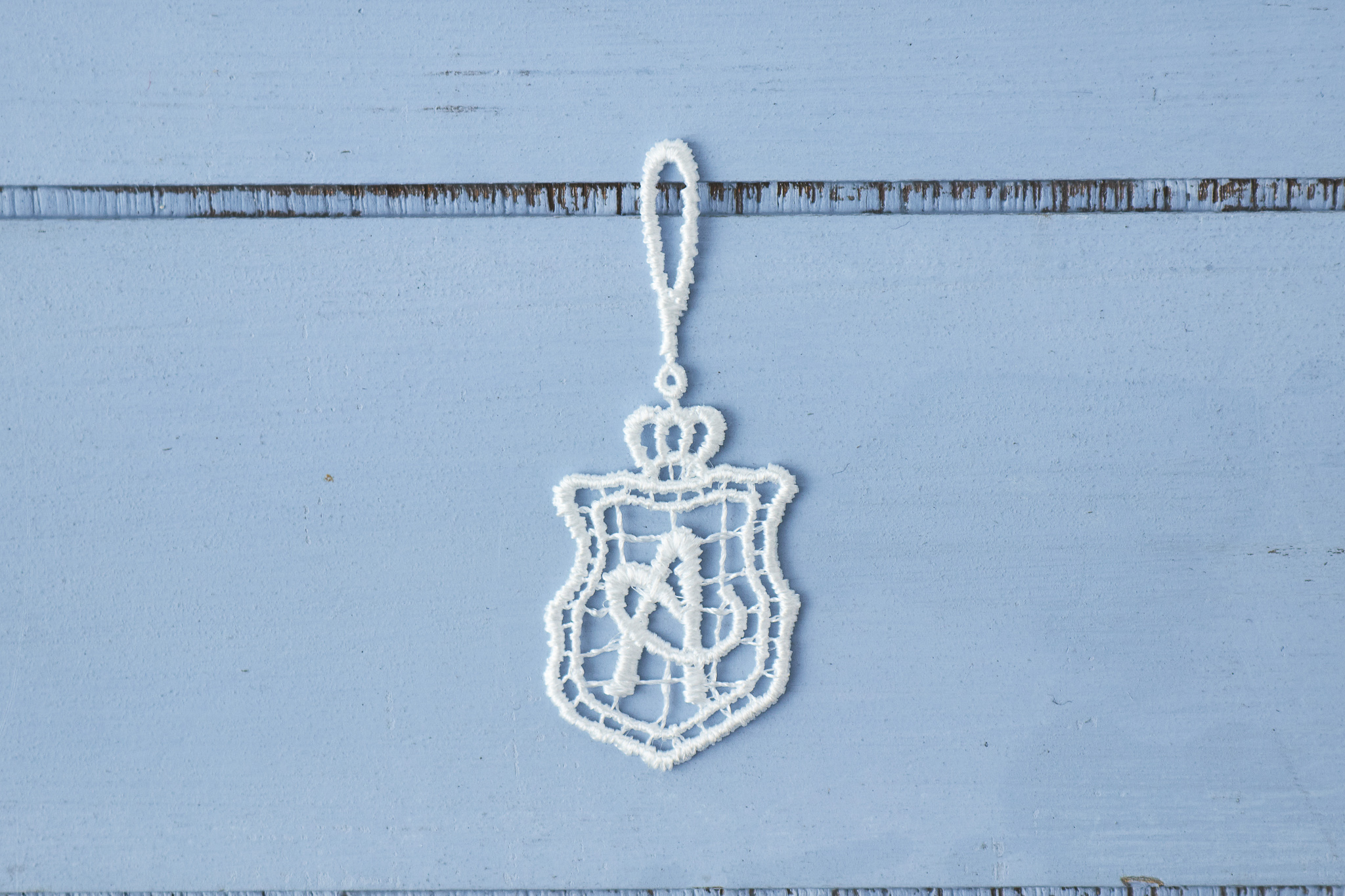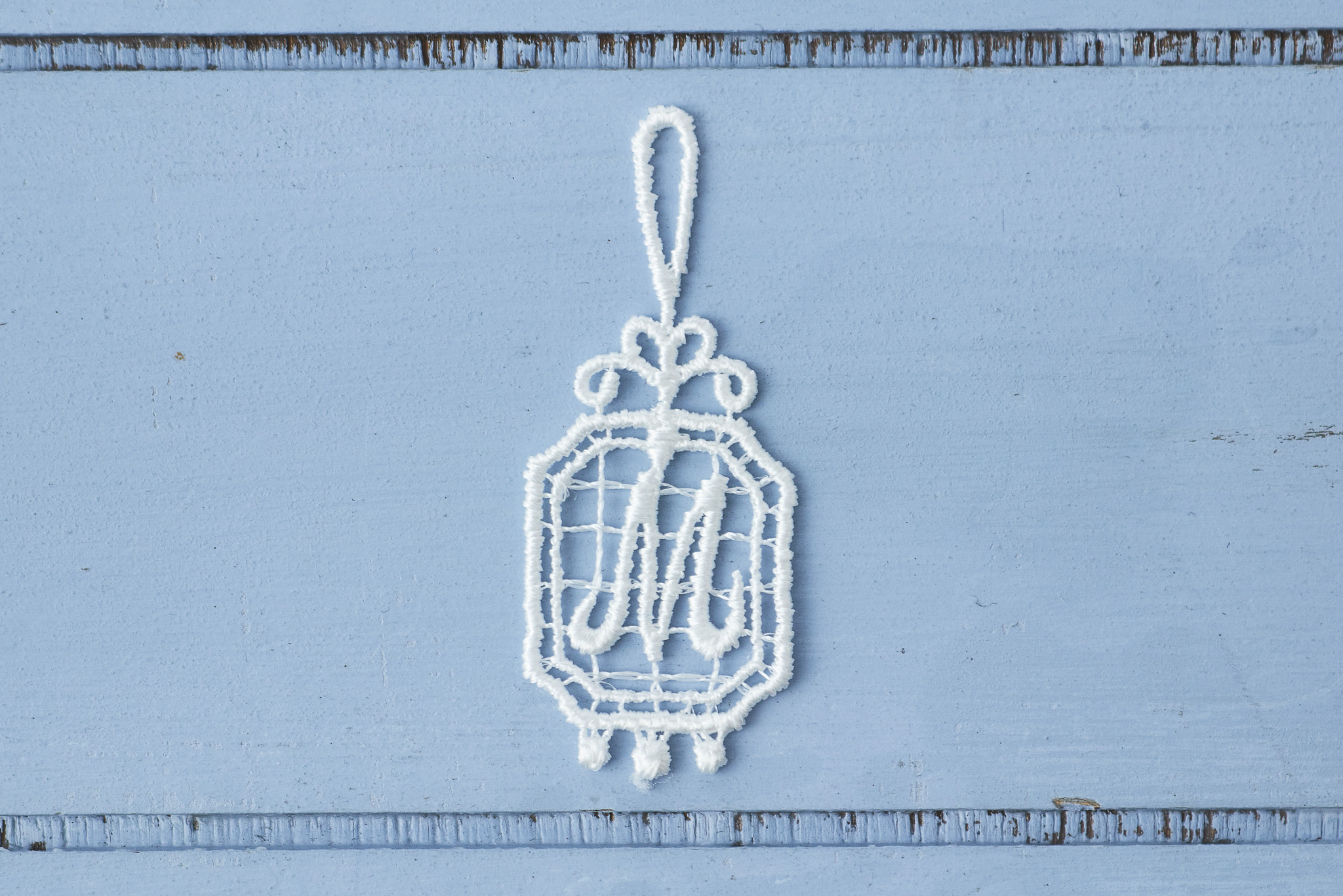 アルファベットを1つ1つデザインを変え、ギュピールレースで仕上げました。 指で簡単に取り付けることができ、楽しいあそび心のあるハンカチが出来上がります。もちろん洗濯機での、お洗濯も可能です。