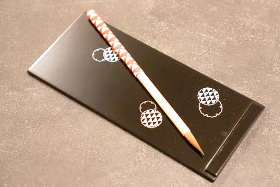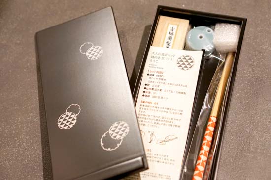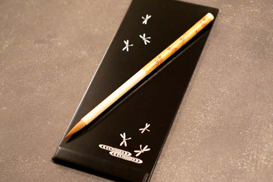 コンパクトな「大人の書道セット」です。細字書道や写経、手紙をしたためる際になど、実用性に優れています。硯箱には越前塗り施し、上質で凛とした趣。蓋は、レーザー彫りで、花丸紋・とんぼ・うろこの3種を筆の柄と合わせてご用意。書道好きなご家族、ご友人への贈り物に。