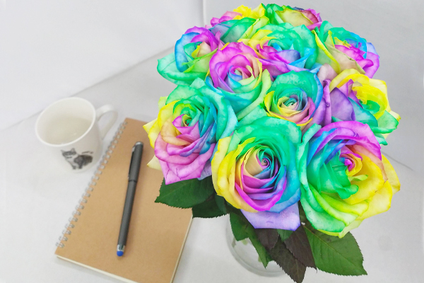 当店のレインボーローズは毎日ご注文に合わせて生産しています。 染まり方は1本1本違いがありご注文のたびに新しい発見があるかと思います。 生花だからこその醍醐味をぜひギフトにご利用ください! ※生花なので多少の大きさ・色見・形が違うことがございます。 雰囲気(季節や仕入れ状況により配色等は異なります)