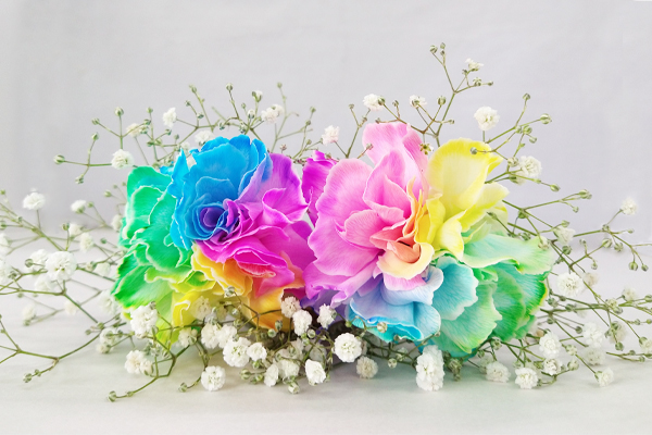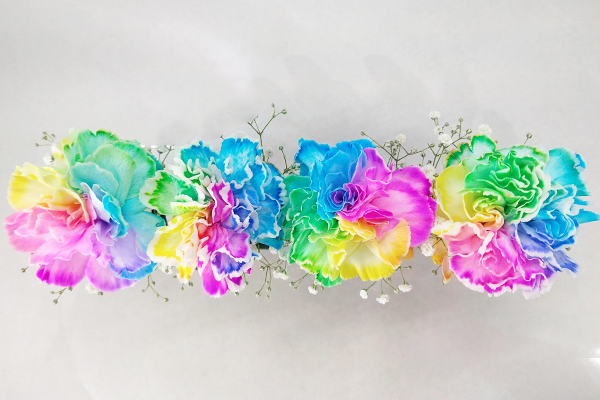 当店のレインボーカーネーションは毎日ご注文に合わせて生産しています。 染まり方は1本1本違いがありご注文のたびに新しい発見があるかと思います。 生花だからこその醍醐味をぜひギフトにご利用ください! ※生花なので多少の大きさ・色見・形が違うことがございます。 雰囲気(季節や仕入れ状況により配色等は異なります)