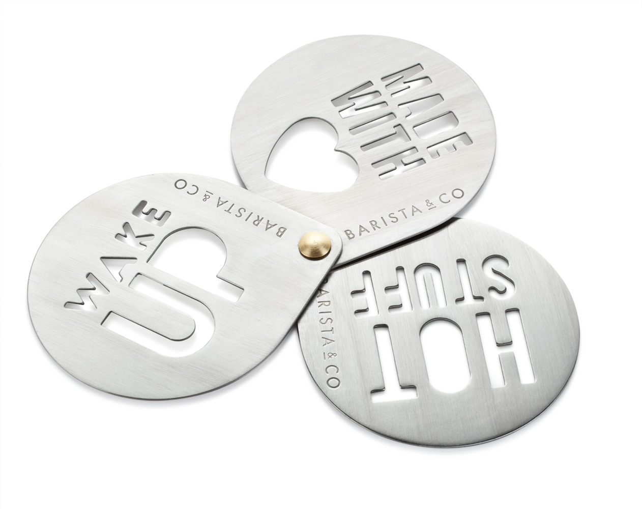 ミルクフォームの上に文字を描くステンシルラテアートを楽しめるステンシル。好きなメッセージを選んで、ココアパウダーやシナモンパウダーを振りかければ、絵心がなくても簡単手軽におしゃれなアートを作る事ができます。[WAKE UP] [MADE WITH ♡] [HOT STUFF] 気分に合わせて3つのフレーズを楽しめます。