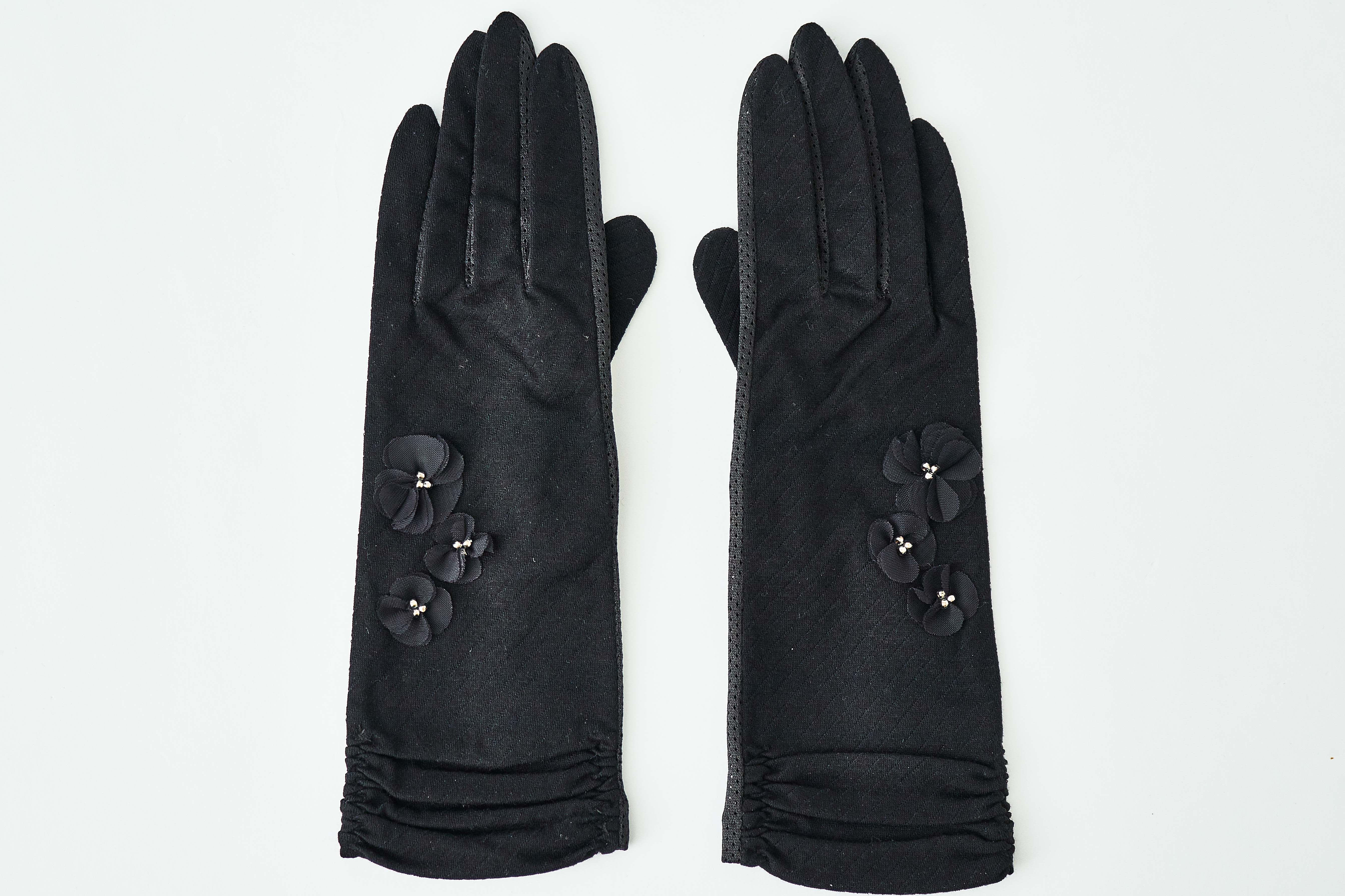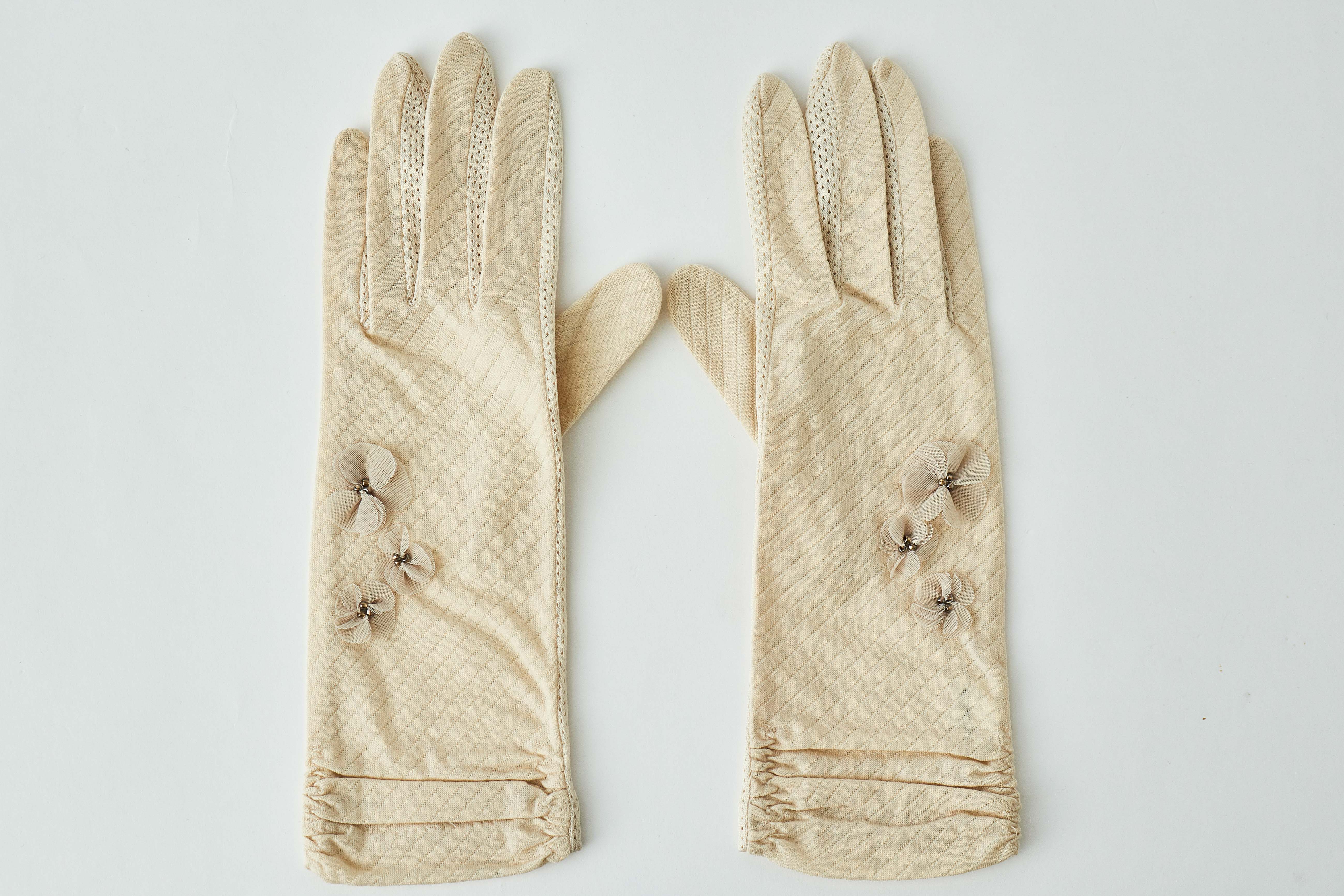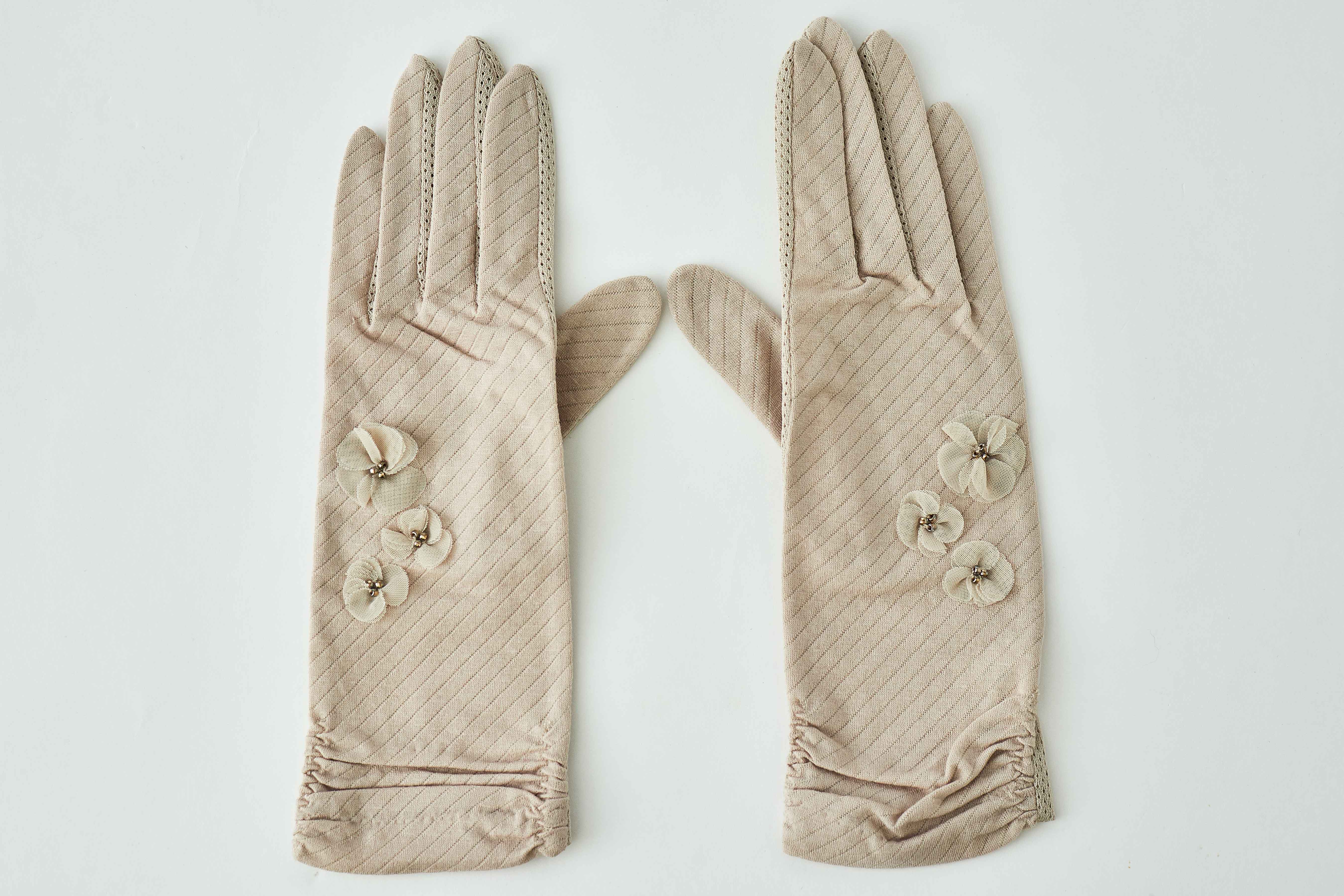 春夏シーズンには欠かせない麻混入の素材です。バイヤスの凹凸感が爽やか表面感で、手の甲部分にはフェミニンな小花のコサージュがデザインされています。掌には、ハンドルやパラソル等手に持った時に滑らないよう、ハート型の滑り止めがアップリケされています。誕生日など、大切な方の特別な日の贈り物としておすすめです。