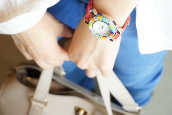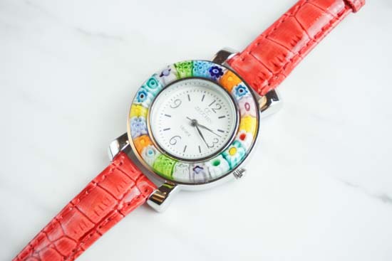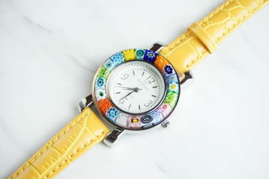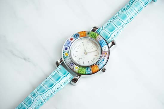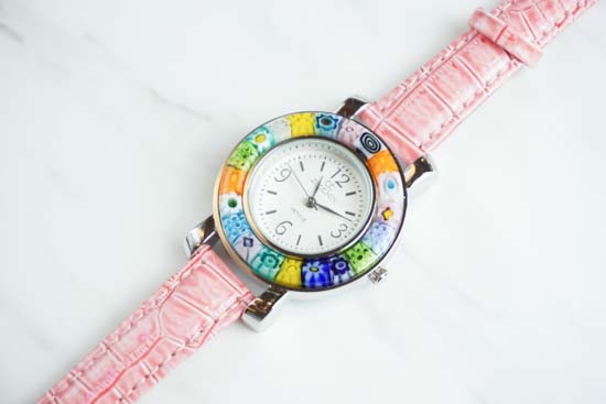 パステルカラーのおしゃれなベルトに、花柄のヴェネチアングラスを用いた文字盤が組み合わされた腕時計。ヴェネチアンブランド特有の可愛いデザインを楽しむことができます。普段使いはもちろんのことながら、パーティーや旅行などでもご使用になっていただくことができます。