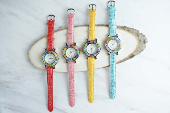 大口注文・法人のお問い合わせはこちら千の花という意味の 「Millefiori」ミルフィオリ棒を輪切りにした星型や花型のムリーネを文字盤周りに配しております。この技法はヴェネチアのムラーノ島でのみ中世より受け継がれている特殊な技法です。