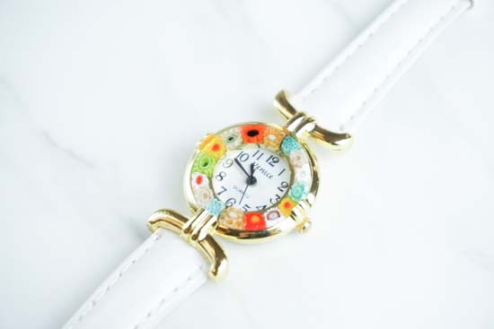 千の花という意味の 「Millefiori」ミルフィオリ棒を輪切りにした星型や花型のムリーネを文字盤周りに配しております。この技法はヴェネチアのムラーノ島でのみ中世より受け継がれている特殊な技法です。 一つ一つ丁寧に作りこまれた自信をもってお勧めできるプレゼントです