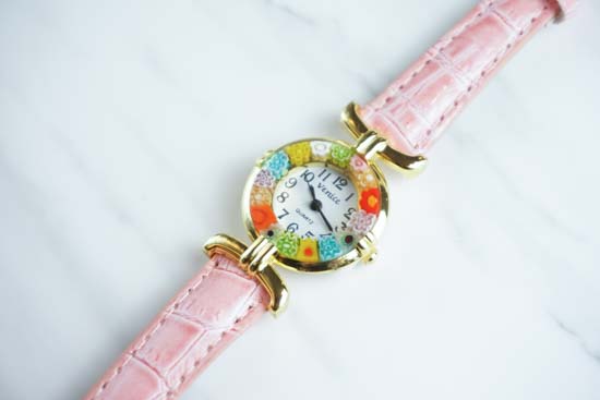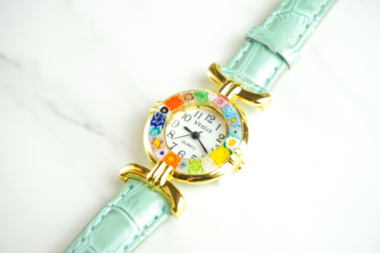 パステルカラーのおしゃれなベルトに、花柄のヴェネチアングラスを用い文字盤が組み合わされた小ぶりな腕時計。ヴェネチアンブランド特有の可愛いデザインを楽しんでいただけます。普段使いはもちろんのことながらパーティーや旅行などでもご使用になっていただくことができます。