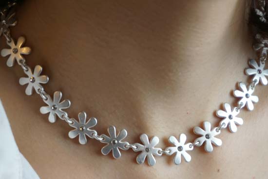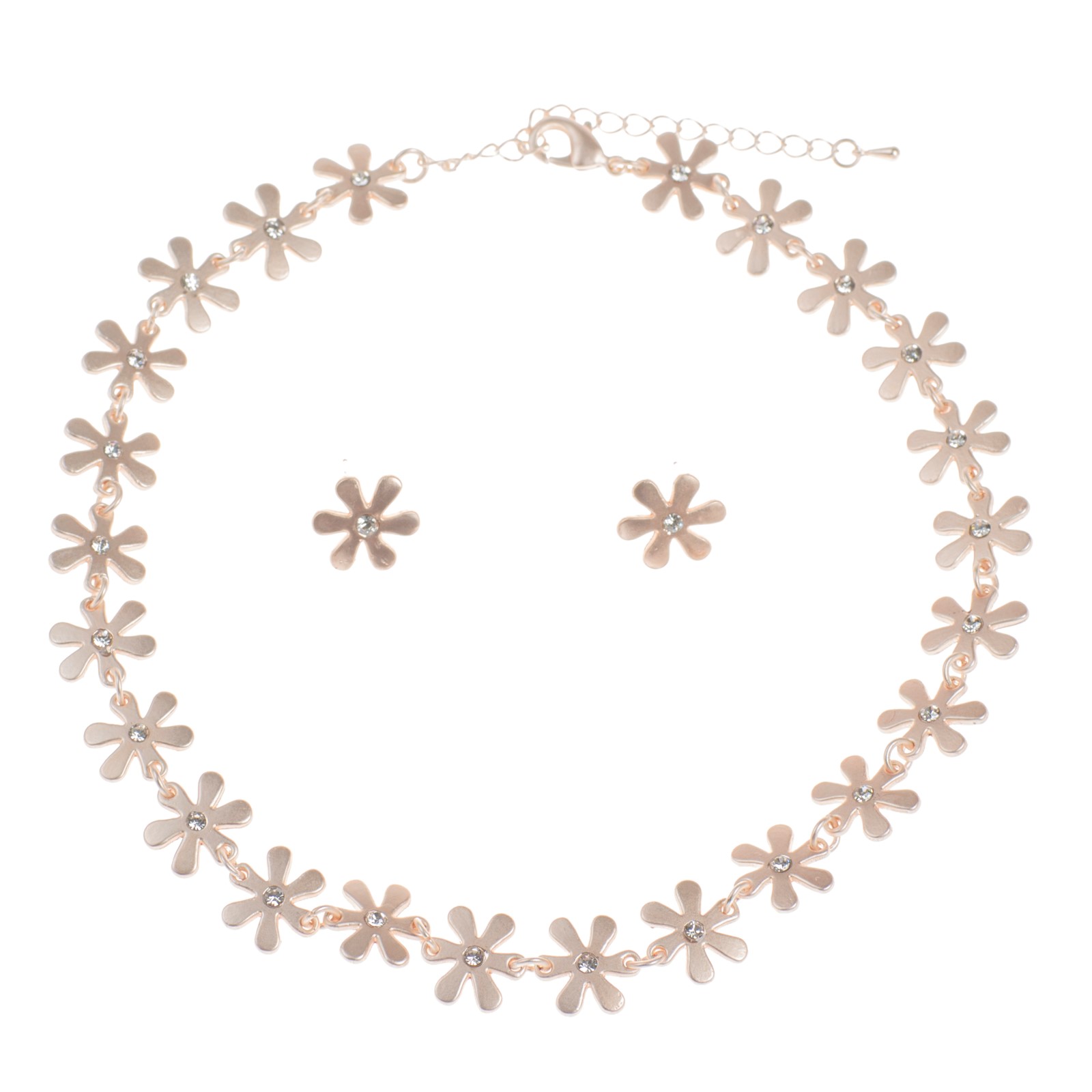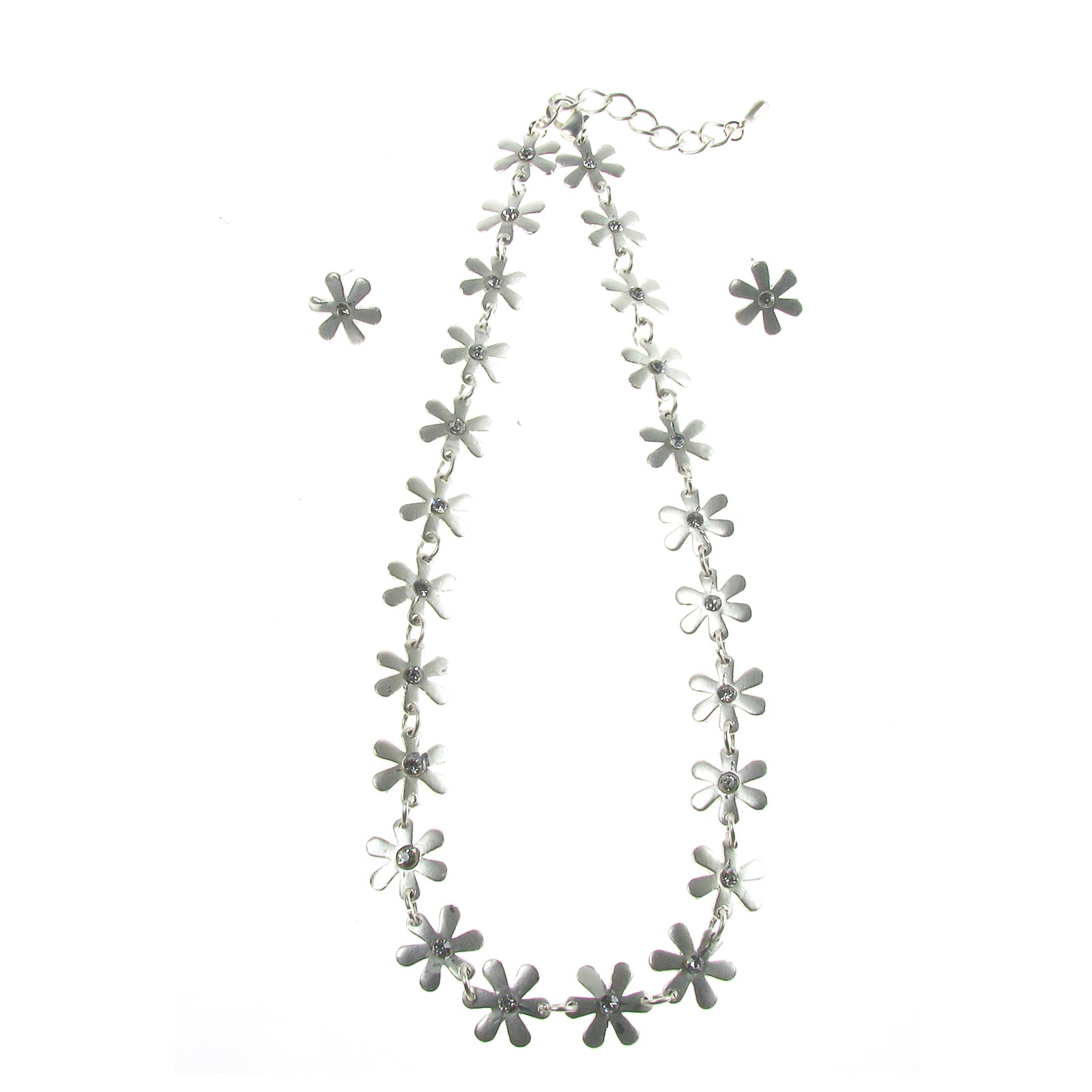 見栄えのする花モチーフのメタルネックレスとピアスです。洗練されたD&Xオリジナルデザイン。リーズナブルなお値段で首周りを華やかに引き立てます。色はマットシルバーとマットゴールドの2色をご用意。普段使いや、パーティやご旅行といったさまざまなシーンでお使い頂けます。
