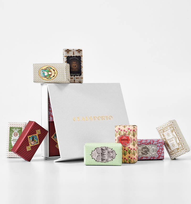 このBOXには、SMART(スマート)、LAVANDRE(ラベンダー)、TANGO(タンゴ)、SUAVE PERFUME(スアーヴェ パフューム)、FOX TROT(フォックス トロット)、8741、BARBEAR(バルベア)、ONDINA(オンディーナ)の8種類のソープが入っています。 ◾️スマート 際立っていながらも伝統的な香りは、4種類のローズぺタルにピオニー、アンバー、アンバーグリスがブレンドされています。 パッケージには、クラウスポルトの1920年代のアーカイブデザインである、スマートの香りをイメージする魅惑的な女性が描かれています。 トップノート:ピオニー、マンダリン、オレンジ ハートノート:ローズ、ブラックカラント ベースノート:アンバーグリス、ムスク ◾️ラベンダー 伝統的なラベンダーの香りにフローラルノートやパチョリをブレンドし、ウッディな要素を加えて香りににフレッシュな深みをもたらしています。 パッケージデザインはクラウスポルトの19世紀のルーツを思わせます。 トップノート:ゼラニウム、ユーカリ ハートノート:ラベンダー、パイン ベースノート:パチョリ、トンカビーン、バニラ ◾️タンゴ あたたかみあるエキゾチックな香りは、タバコリーフが主役です。スパイシーシナモン、バジル、ブロードビーンと混ざり合い、この香りを奥深く、濃厚にしています。 パッケージには、タンゴを踊っている華やかなカップルのヴィンテージ画が描かれています。 トップノート:シナモン、アニス ハートノート:タバコ、バニラ、バジル、ブロードビーン ベースノート:トンカビーン、バルサミック ◾️スアーヴェパフューム いきいきしたレモンバーベナの香りを想起させる、朝の日差しで光り輝くプロバンスの庭からインスピレーションを得ています。シトラスのブーケは、ミントとムスクによって複雑さが添えられています。 トップノート:ミント ハートノート:レモンバーベナ ベースノート:ムスク ◾️フォックストロット 甘くフェミニンな香りは、ブラックカラントとミモザがブレンドされたバイオレットが香ります。ムスクとベチバーがベースとなり、甘い香りを和らげています。 パッケージには、ベルエポックの美しいダンサーが描かれています。 トップノート:ブラックカラント、ガルバナム ハートノート:バイオレット、ミモザ、ピオニー ベースノート:ベチバー、ムスク、ラズベリー ◾️8741 フルーティでウッディな香りは、ミモザ、ペア、ゼラニウムのノートと対比し、サンダルウッドとムスクにより興味深く、印象的な香りを創造しています。 トップノート:ゼラニウム、フルーティ、ベルガモット ハートノート:ペア、サンダルウッド、ローズ、ジャスミン ベースノート:シダー、ムスク ◾️バルベア 夏を感じるフルーティな香りは、グレープフルーツ、フィグ、バニラをブレンドした魅力的な香りです。 化粧台でひげを剃る男性が描かれた古い広告画像がパッケージになっており、その商品名はポルトガル語の「剃る」に由来します。 トップノート:シトラスアコード、フィグ ハートノート:グレープフルーツ、ローズ ベースノート:バニラ、ウッディアコード ◾️オンディーナ 爽やかな潮風の印象を作り出す香り。フルール・ド・セルの香りにベルガモット、サンダルウッド、ベチバーをブレンドしています。 パッケージには、波から起き上がる神秘的な女神のアールヌーボー画が描かれています。 トップノート:フルーティ、ベルガモット ハートノート:ホワイトフラワー、アクアティック、ベチバー ベースノート:ムスク、シダーサンダルウッド