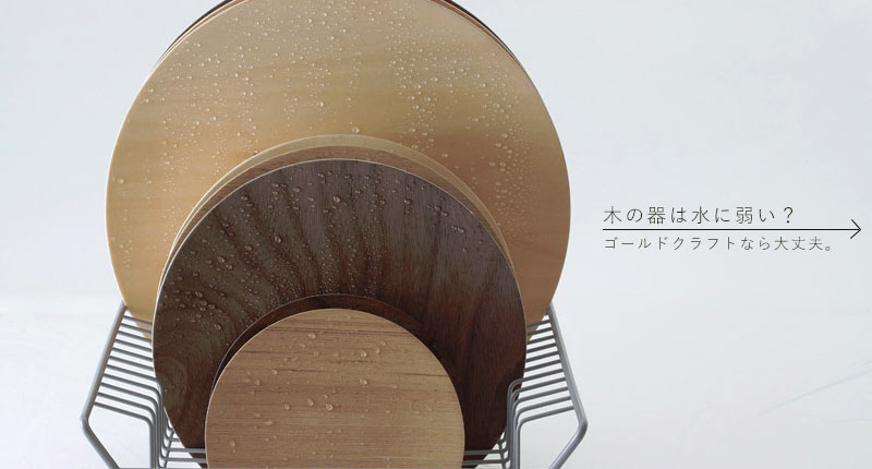 大口注文・法人のお問い合わせはこちら木の器は水に弱いと思っていませんか? ゴールドクラフトの器は工業試験場における業務用食器洗浄機3,000回の洗浄試験においても製品に変化はなく、耐水性には全く心配がないことが確認されています。 また、適度な粘りがあるプライウッド(成形合板)だから、うっかり落としても割れません。木の軽さと雰囲気を保ちながら、丈夫で水にも強い。ゴールドクラフトの器はいつもの食卓で、他の磁器製食器と同等にお取扱いいただけます。