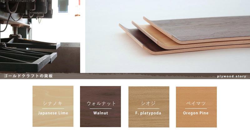 製品は、木目を交互に積み重ねた「芯材」と、天然木の突板である「表面材」を金型に挟み、1cmあたり数十kgの圧力で圧縮プレスして成形しています。このため、木を削り出したり、くり抜いて作る他の木製品と比べて薄く、軽く、丈夫な製品が出来上がります。 また、シート状に桂剥きした材料を積み重ねて使用するため、捨てる部分が非常に少なく、省資源な製法であることも特徴です。ゴールドクラフトでは森林の伐採が環境に与える影響を考慮して、芯材の選定や表面材の仕入れにも気を配っています。