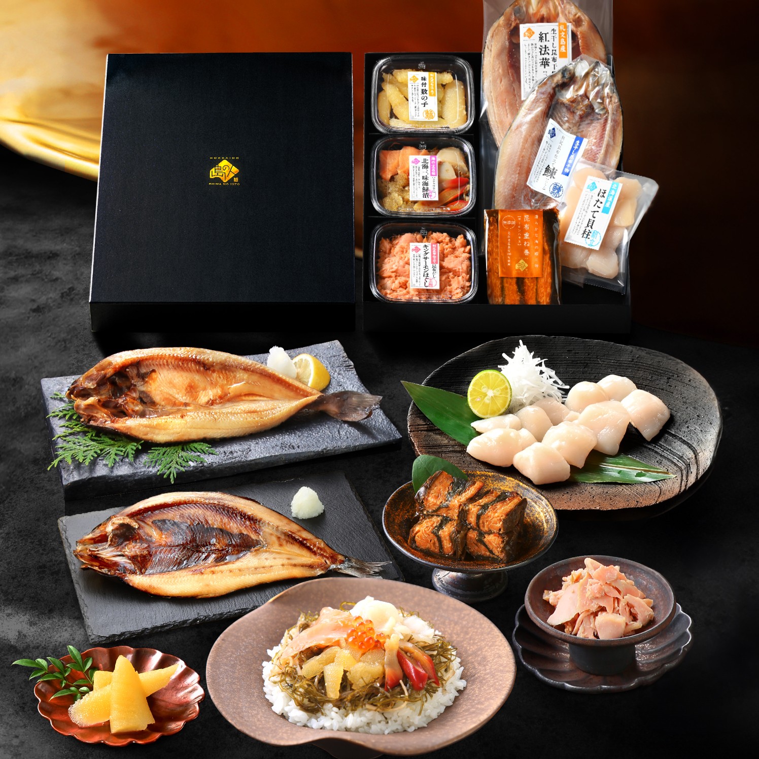 | 原材料(原産国含む) | ●北海三昧 海鮮漬 ホタテ貝柱(北海道産)、砂糖、醤油、サーモン、数の子、ホッキ貝、するめいか、昆布、利尻昆布エキス、米発酵調味料、いくら醤油漬(鱒卵、醤油、みりん、昆布エキス、かつお節エキス)、魚介エキス、昆布エキス、酵母エキス/調味料(アミノ酸等)、(一部に小麦・いか・いくら・さけ・大豆を含む) ●昆布だし秋鮭ほぐし 秋鮭(北海道斜里産)、昆布塩(食塩、昆布粉末)、昆布醤油(大豆、小麦、昆布、糖蜜、アルコール)、礼文だし(昆布エキス、かつお節エキス、根昆布)/調味料(アミノ酸等)、酸味料、増粘多糖類、甘味料(ステビア)、カラメル色素、(一部に小麦・さけ・大豆を含む) ●昆布干物 紅法華(加熱用) ホッケ(北海道産)、食塩、利尻昆布エキス ●昆布干物 鰊 (加熱用) ニシン(北海道産)、食塩、利尻昆布エキス ●サーモンハラス昆布重ね巻 サーモントラウト(チリ又はノルウェー産)、昆布(北海道産)、砂糖、醤油、水飴、みりん、(一部に小麦・さけ・大豆を含む) ●味付け数の子 ニシンの卵巣(北海道産)、米発酵調味料、醤油、食塩、砂糖、かつお節エキス、和風だし(かつお節、昆布エキス、還元水あめ)、たん白加水分解物/調味料(アミノ酸等)、ソルビトール、酒精、酸味料、ビタミンB1、(一部に小麦・大豆を含む) ●ほたて貝柱(生食用) ホタテ貝柱(北海道産) |