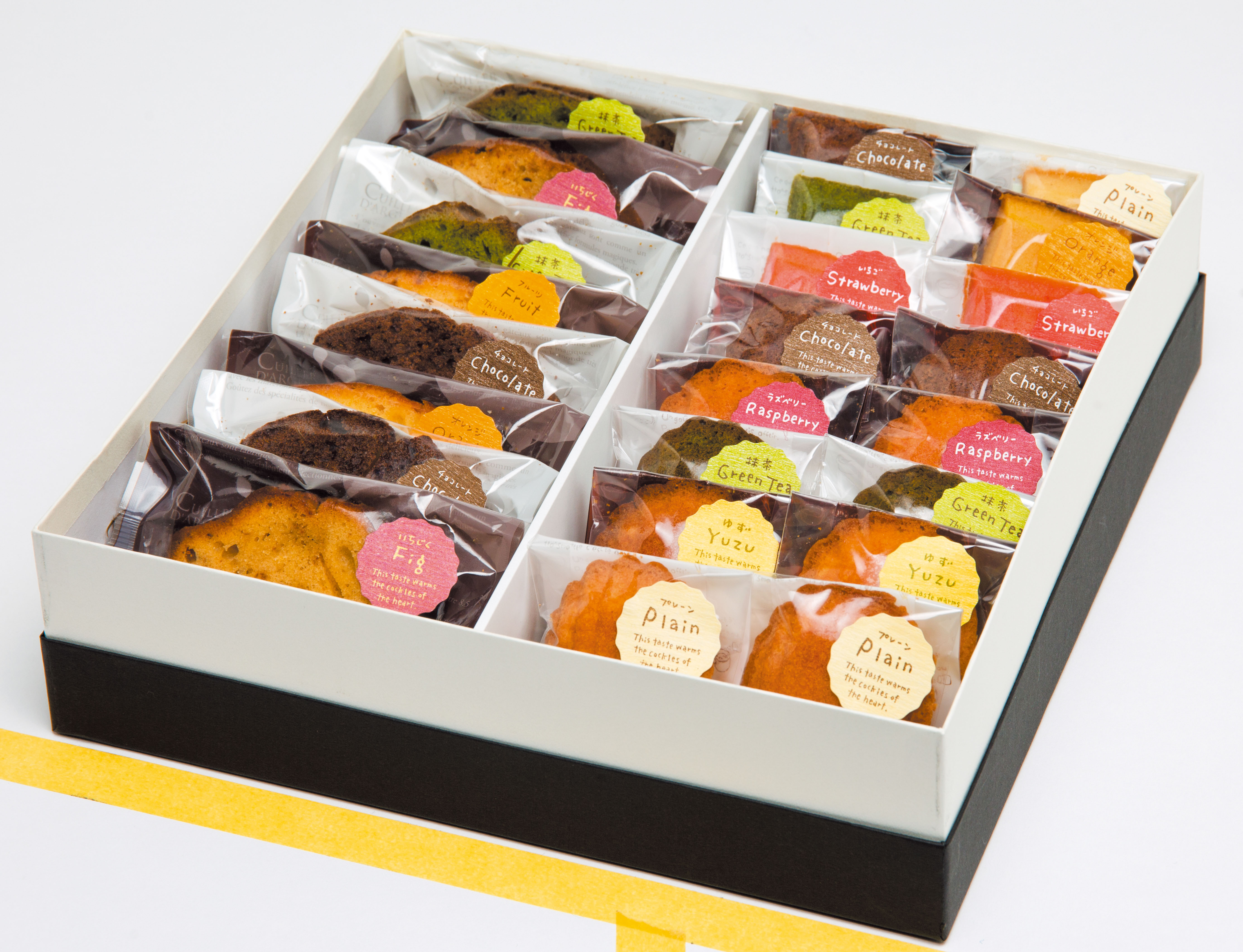 | 総重量 | 1020g(箱込み) フィナンシェ6個・マドレーヌ10個・パウンドケーキ8個 |