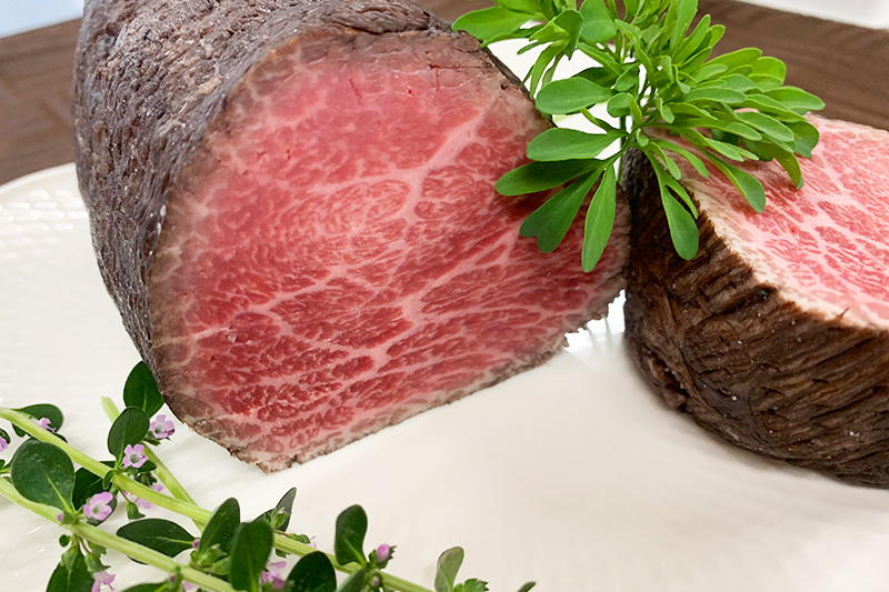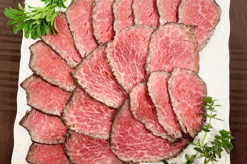 佐賀牛と宮崎牛に限定した、上質な黒毛和牛。赤身が生きる「A4」ランクを特選して、あっさりと食べやすくしっとり柔らかなモモ肉でローストビーフをしたためました。