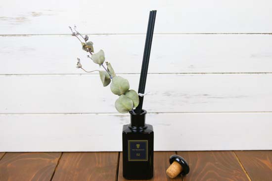 02は柑橘系の香りで爽やかな空間を作ってくれます。 スティックと一緒に付属のユーカリのドライフラワーを挿してお使い下さい。 レモン、グレープフルーツ、ティートゥリーレモン、ローズマリー、マジョラムのエッセンシャルオイルが配合されています。