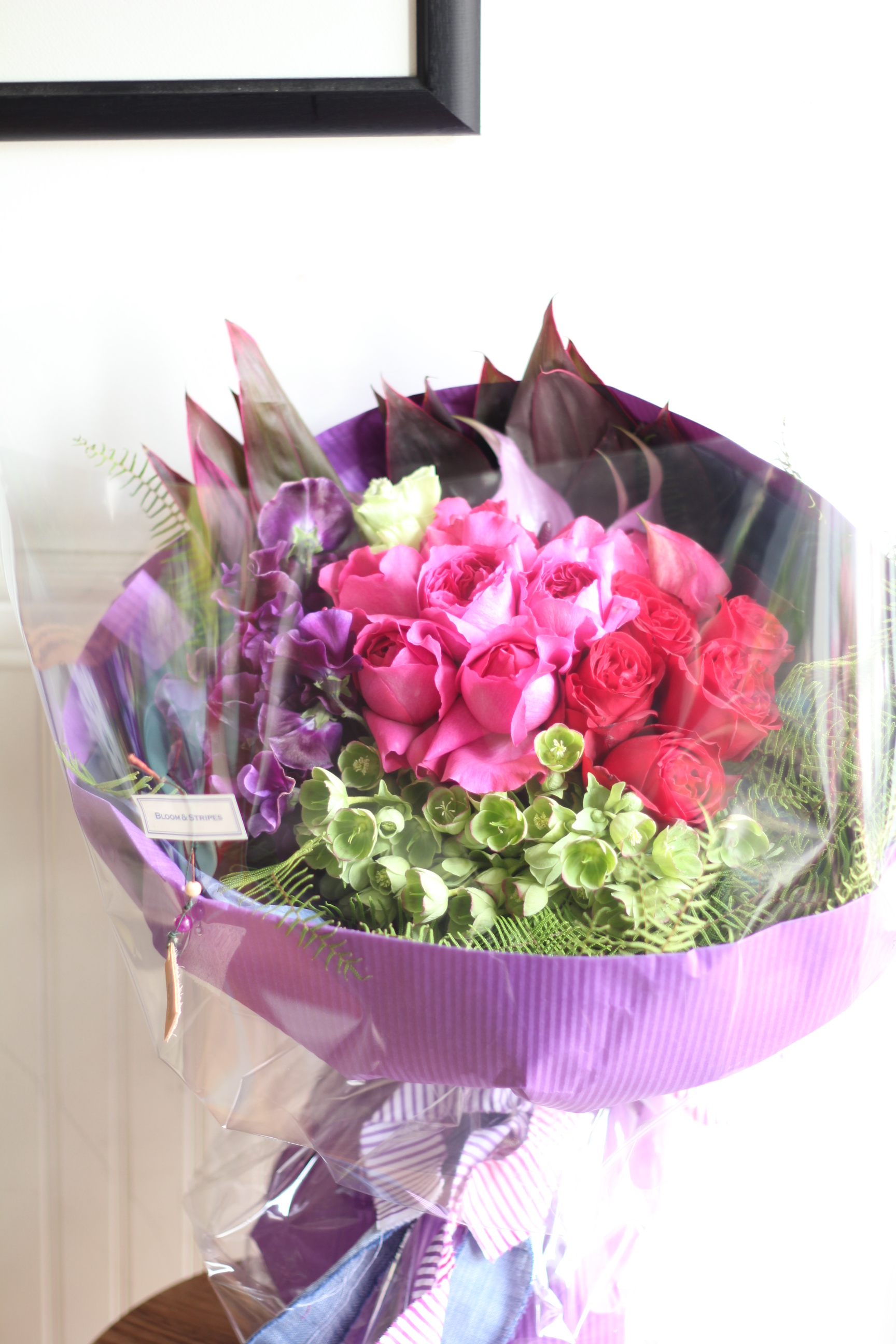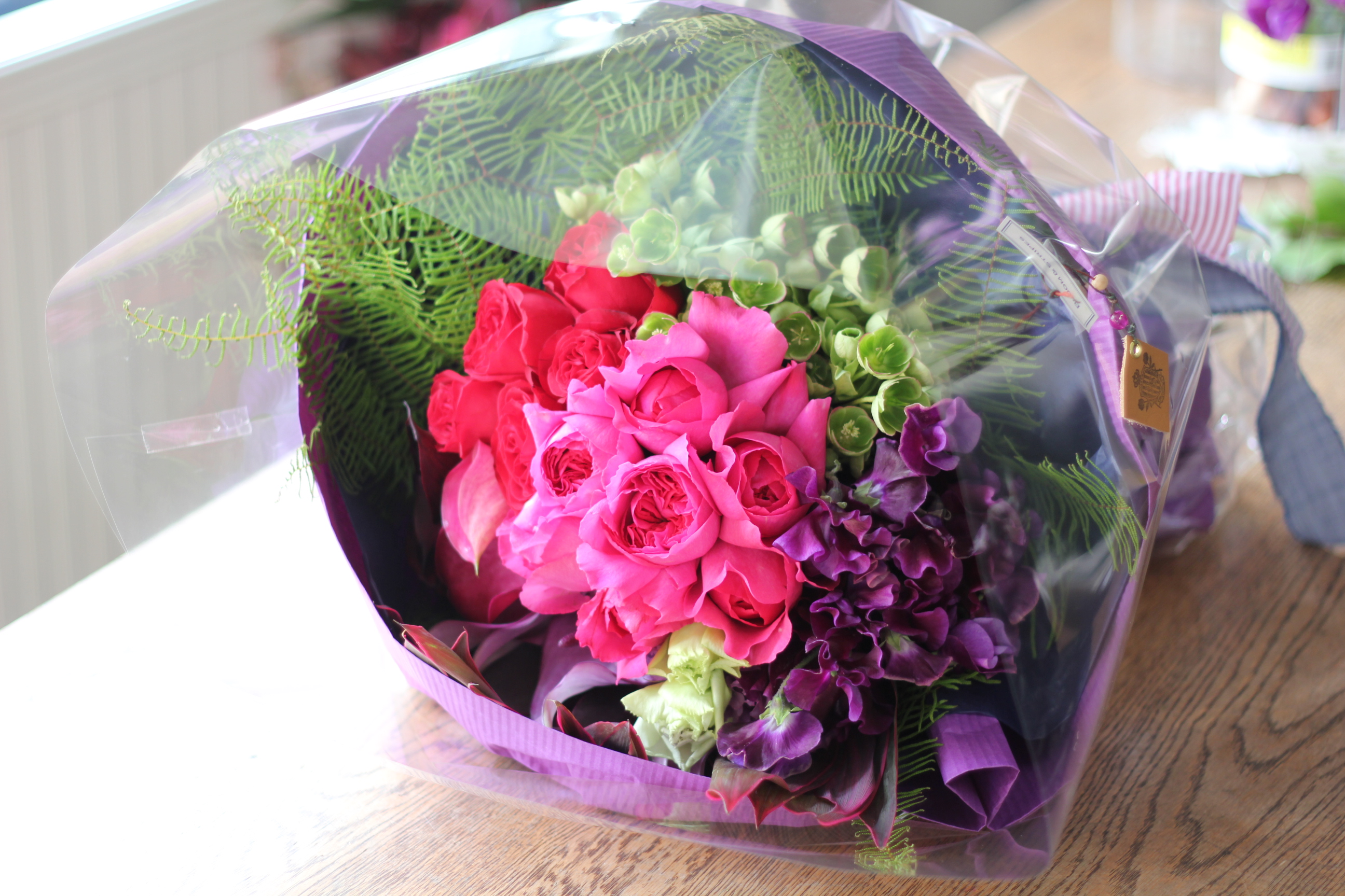 華やかなラッピングの花束は、サプライズギフトとしてもおすすめです。