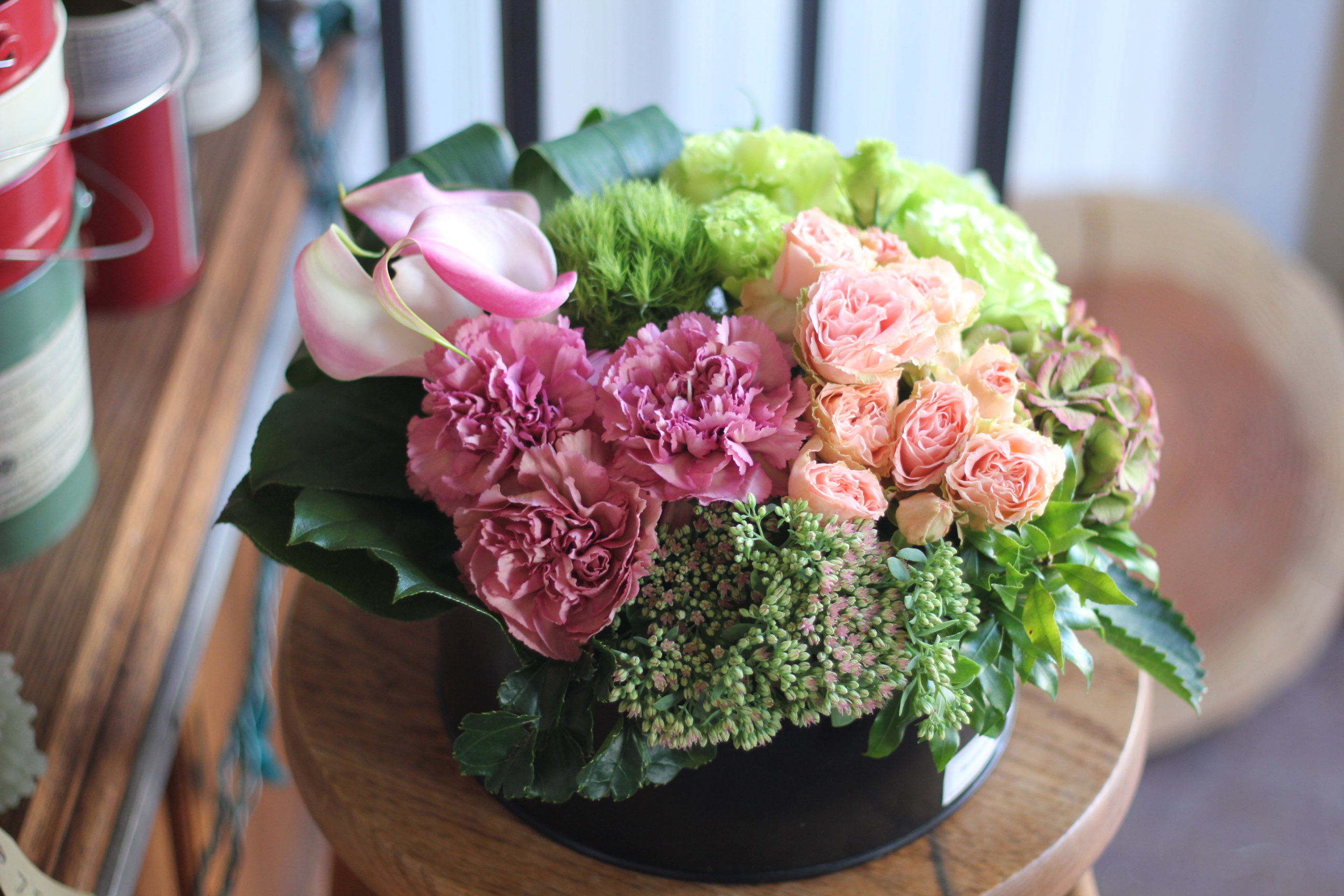 テーブルなどに飾りやすい、高さを抑えた広がりのあるアレンジメントです。