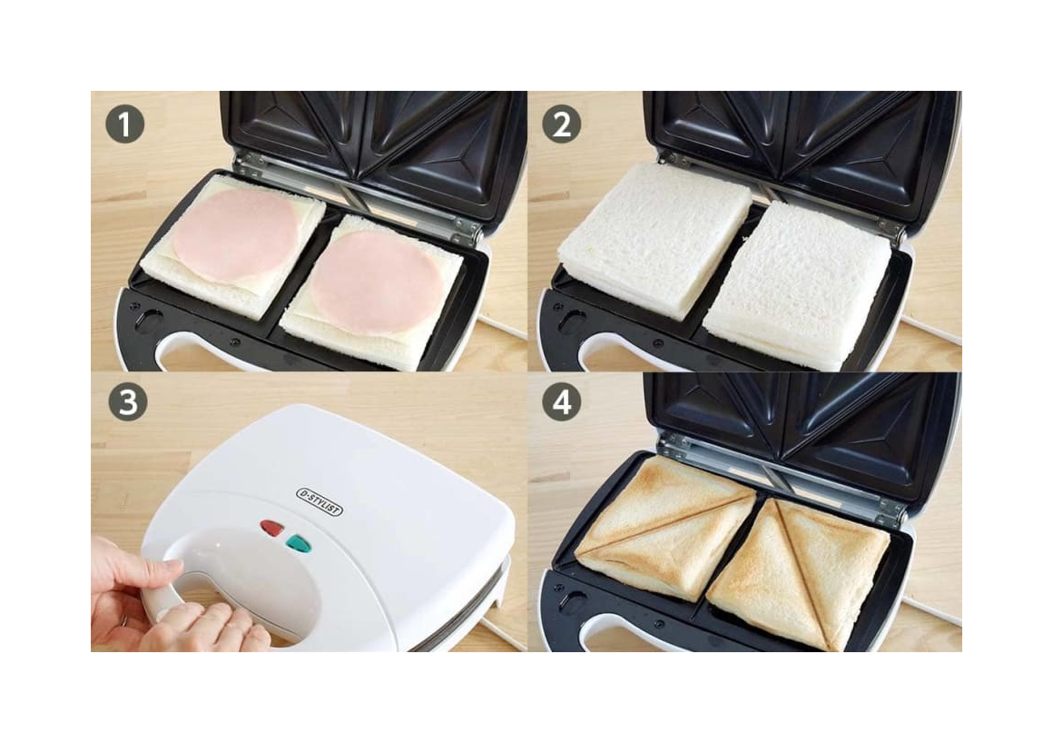 1.本体にパンと具材をのせる。 2.パンをのせる。 3.フタを閉めて約5~6分待つ。 4.できあがり。 ※8〜10枚切りの食パンの耳を切り落としてください。