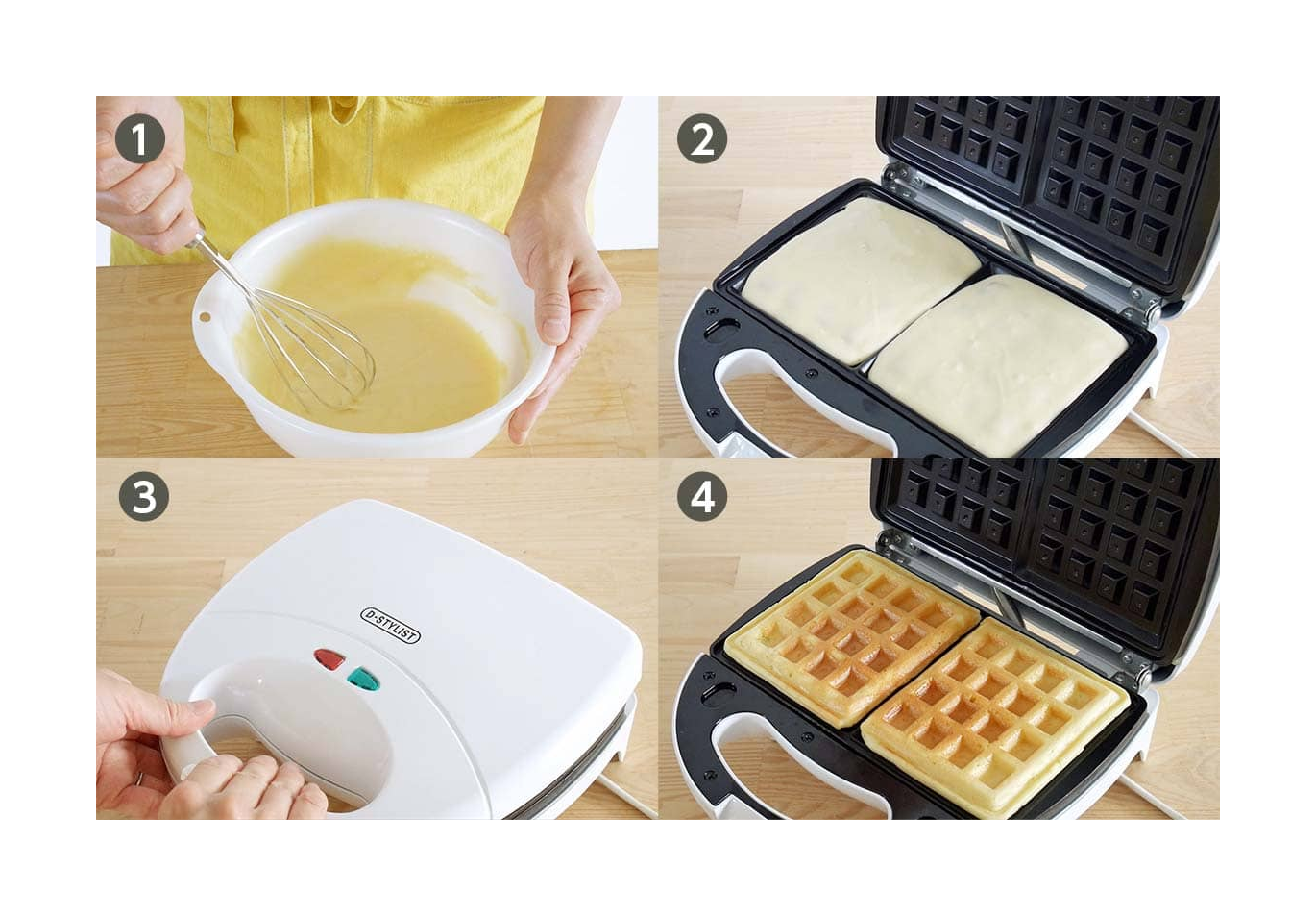 1.材料を混ぜる 2.生地を流しこむ 3.フタを閉めて約3~4分待つ 4.できあがり。