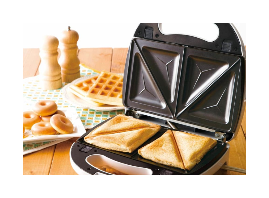 大口注文・法人のお問い合わせはこちら3種のプレートを付け替えればホットサンド、ワッフル、ドーナツがこの1台で簡単に作れます。 材料を入れて挟むだけ。 短時間でおいしいおやつや軽食が楽しめます。