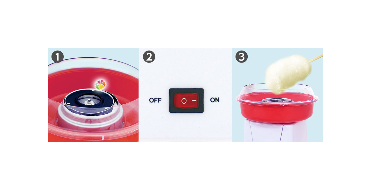 1.あめ玉かザラメを投入口にいれる 2.電源をONにする 3.わたあめが糸状に広がってきたら、割り箸に絡め取りわたあめをつくる