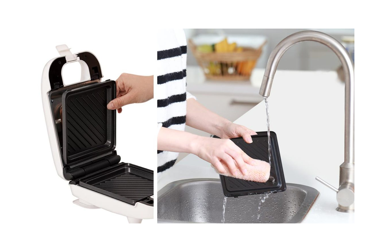 お好みの食材をパンにのせてフタを閉めるだけ。約3分でサクッと香ばしいホットサンドが焼きあがります。耳付き食パンを使えるので、耳を切り落とす手間もありません。着脱式プレートなので、水洗いできてお手入れ簡単です。油をひかずに調理できるのでノンオイルでヘルシーです。