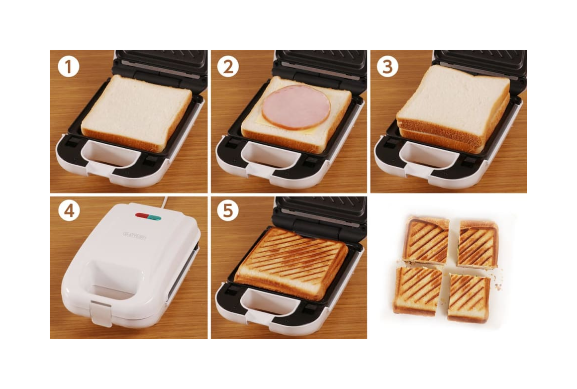 1.本体にパンをのせる。 2.具材をのせる。 3.パンをのせる。 4.フタを閉めて約3分待つ。 5.できあがり。 お好みでカットしてお召し上がりください。
