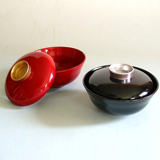 金銀のつまみがおしゃれなペアのお椀。端反り(はぞり)といって、ちょっと開いた形なので、使いやすいのも魅力です。