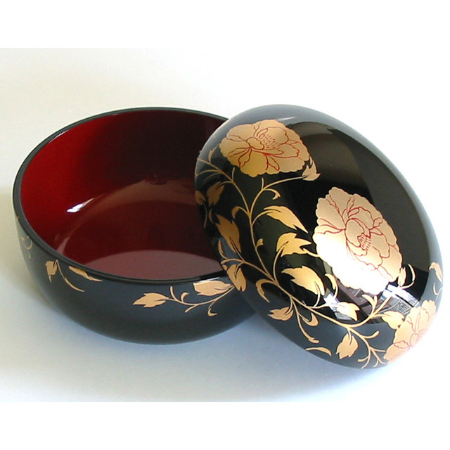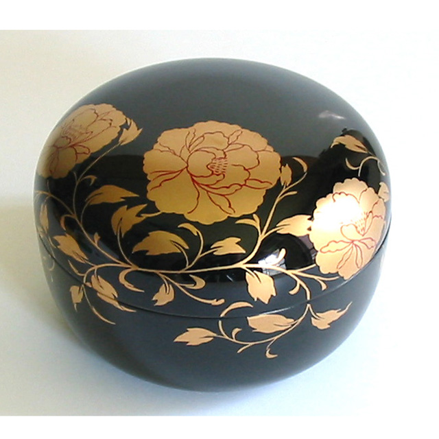 金色で描いた、大きな花と唐草を組み合わせたデザインがとても美しい、漆塗りのお菓子入れです。