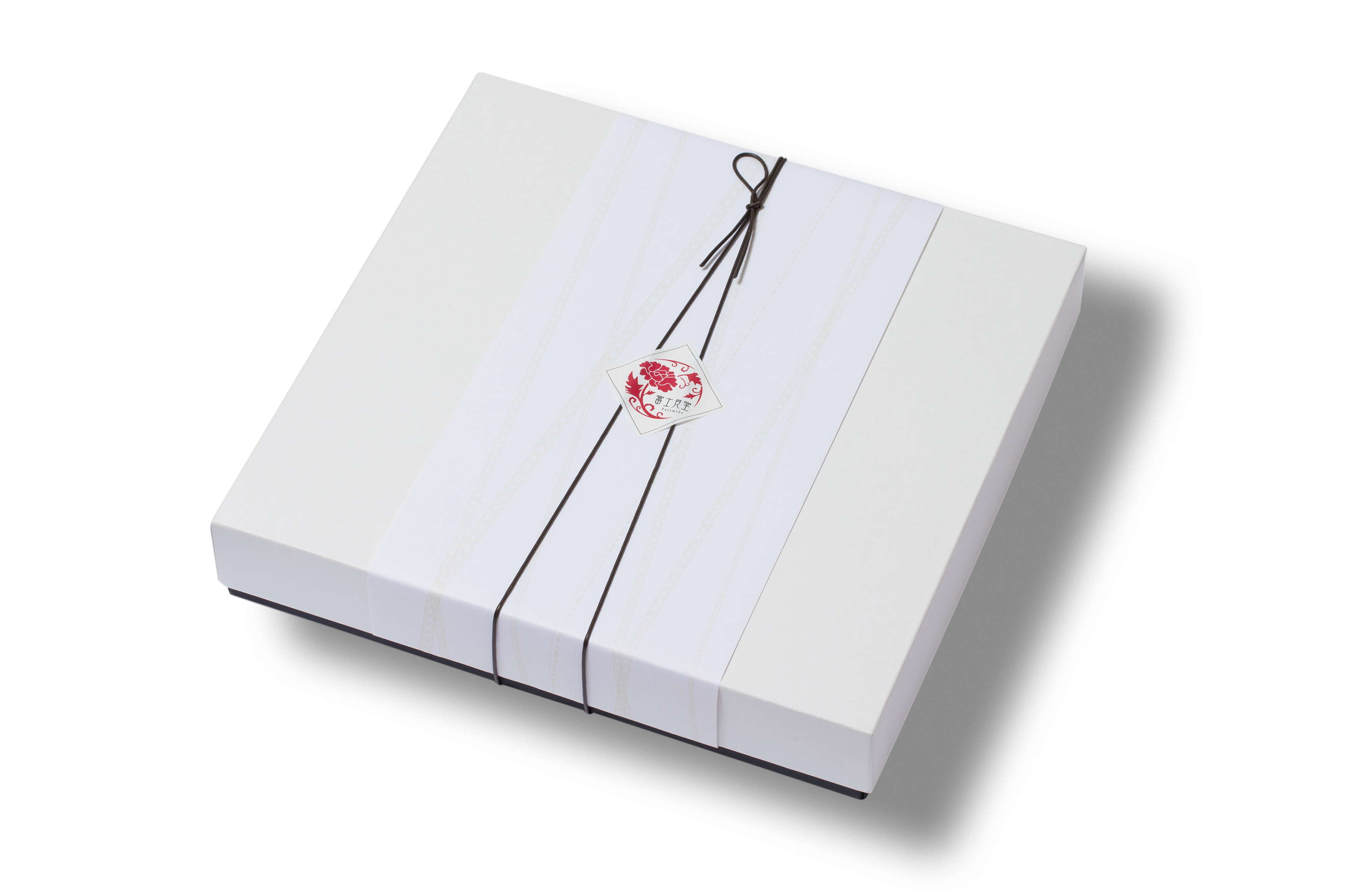 シックな黒の身に上品な白の蓋をした化粧箱。富士見堂オリジナルデザインの帯を巻き、リボンとロゴシールでお留めしました。