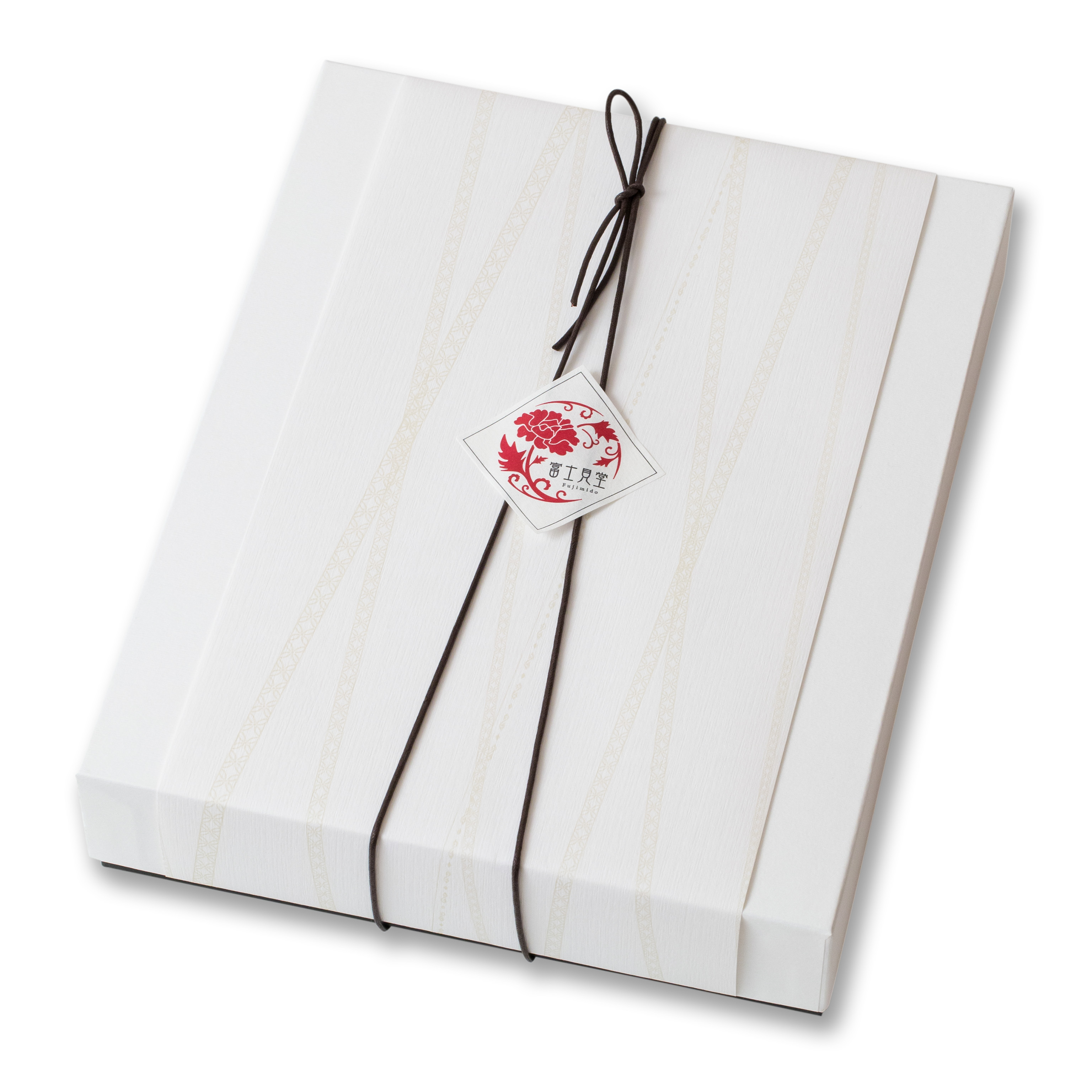 シックな黒の身に上品な白の蓋をした化粧箱。富士見堂オリジナルデザインの帯を巻き、リボンとロゴシールでお留めしました。