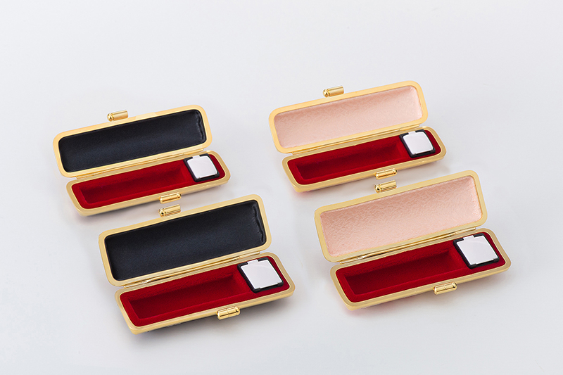大口注文・法人のお問い合わせはこちら金メッキ仕上げの枠が高級感を醸し出す上品な印鑑ケース。人前でハンコを押す場面で自信を持って手にすることが出来る素敵なケースです。