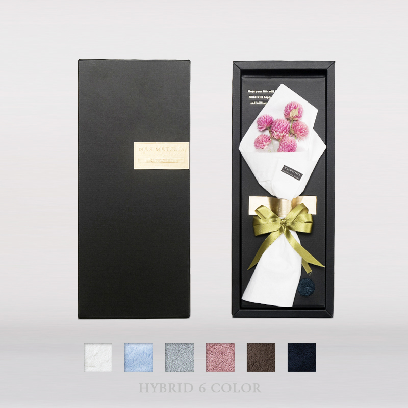 世界で唯一日本で生産される希少価値の高い木から生まれた素材を使用。 見た目の美しさだけでなく、触感、質感、サイズに至るまで細部までしっかり設計されたタオルです。 贈る瞬間から、使う瞬間、その後まで続く、特別な商品となっています。最高の人生に、最高のタオルをどうぞ。 コットン素材ではなく木から生まれた素材を使っているため、肌触りは特別です。 パイル部分はシルクよりもしなやかで、カシミヤよりも細い繊維でできています。 吸水性をバイレック法という試験方法で測定したところ、コットンタオルの約4倍水を吸うことがわかりました。 このため、サイズを通常一般的なタオルよりもコンパクトにすることができ、 洗濯や収納の際にもかさばらず、とても使い勝手の良いサイズにできました。 男性でもフェイスタオルで全身が拭けてしまうくらいの性能があります。 MAXMATERIAは織りネームにもこだわりがあり、全国のお守りを作っている工場で製造されています。 ブランドの顔でもあるネームデザインを表現するためにはどうしても必要でした。縁起が良いという 意味も込められていますが。。 パッケージには木の年輪を連想させるデザインが採用されており、高級感が漂います。 使用しているドライフラワーは「千日紅」。花言葉は「色あせぬ愛情」「不朽」「永遠の命」 百日紅(サルスベリ)よりも花の色が変わりにくいことから、より長い命、幸せを願うという想いを込められた花名で、”あなたの大切なひとの幸せがずっと続きますように”という願いを込めました。 生の花束はもらった後が大変ですが、こちらは華やかで実用性があるということで 多くの方に選ばれています。 いろいろなタオルがある中で、一度は使ってみたい高級タオルです。 お風呂に入るのが楽しみになる、そんな逸品です。