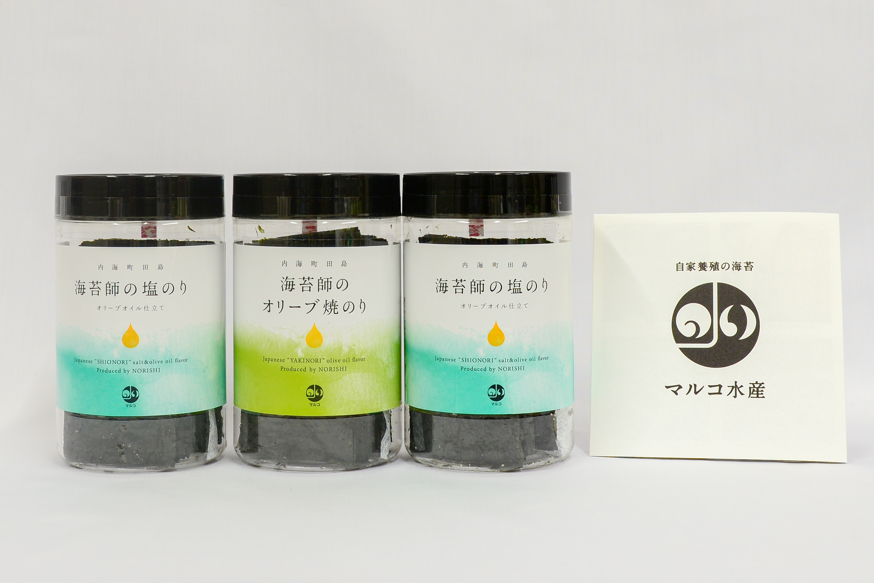 | 原材料 | 《塩のり》 乾海苔(瀬戸内海産)、オリーブオイル、食塩 《オリーブ焼のり》 乾海苔(瀬戸内海産)、オリーブオイル |