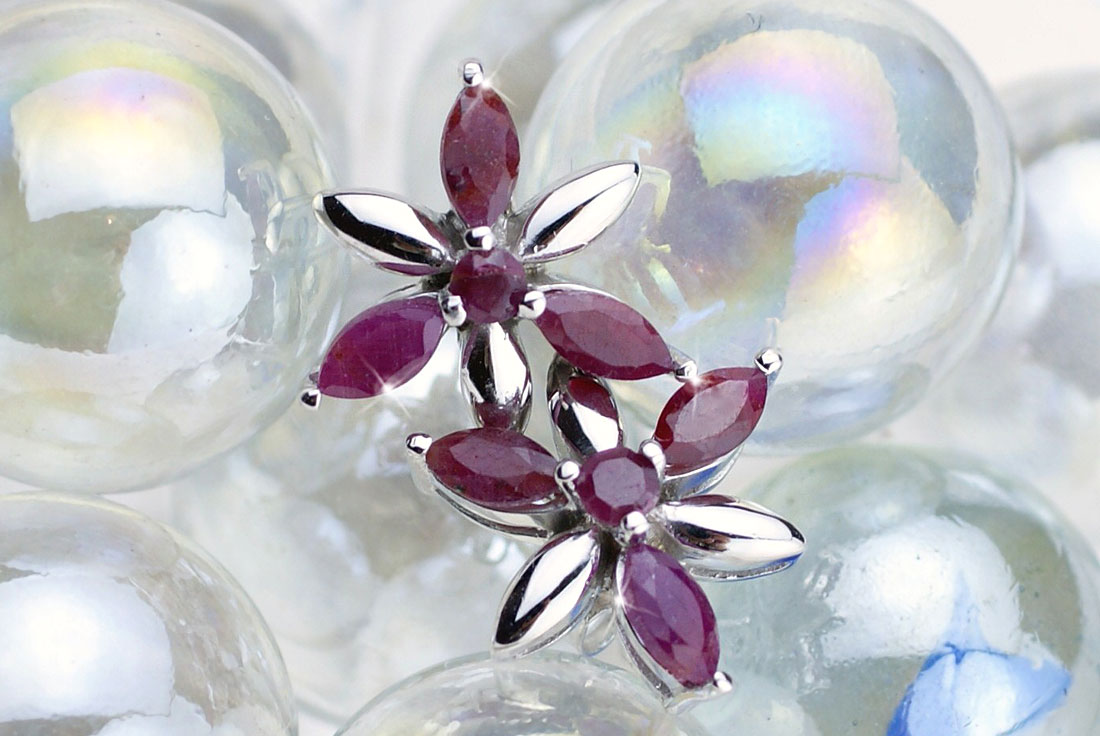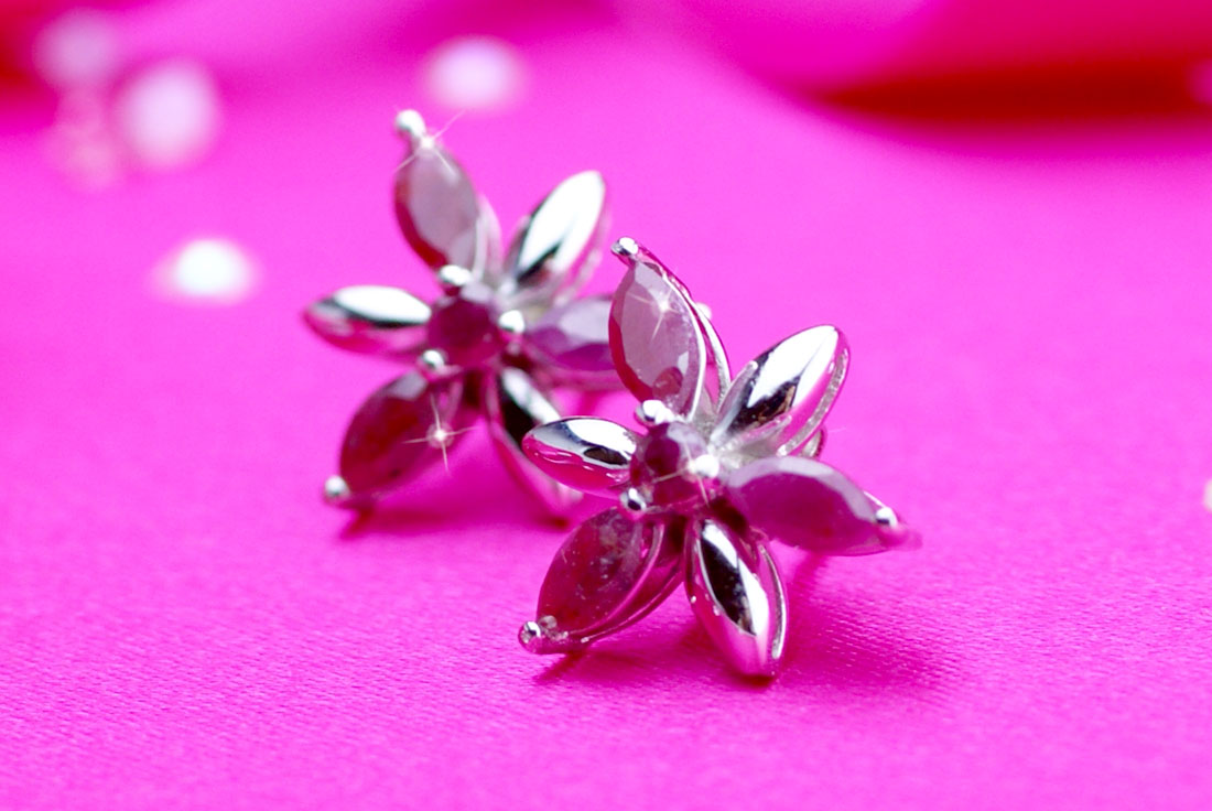 大口注文・法人のお問い合わせはこちらルビーの赤がメタルに映えて美しい、花のようなピアス。 身に付けるだけで、貴女の表情が華やぎ、優雅さを演出します。